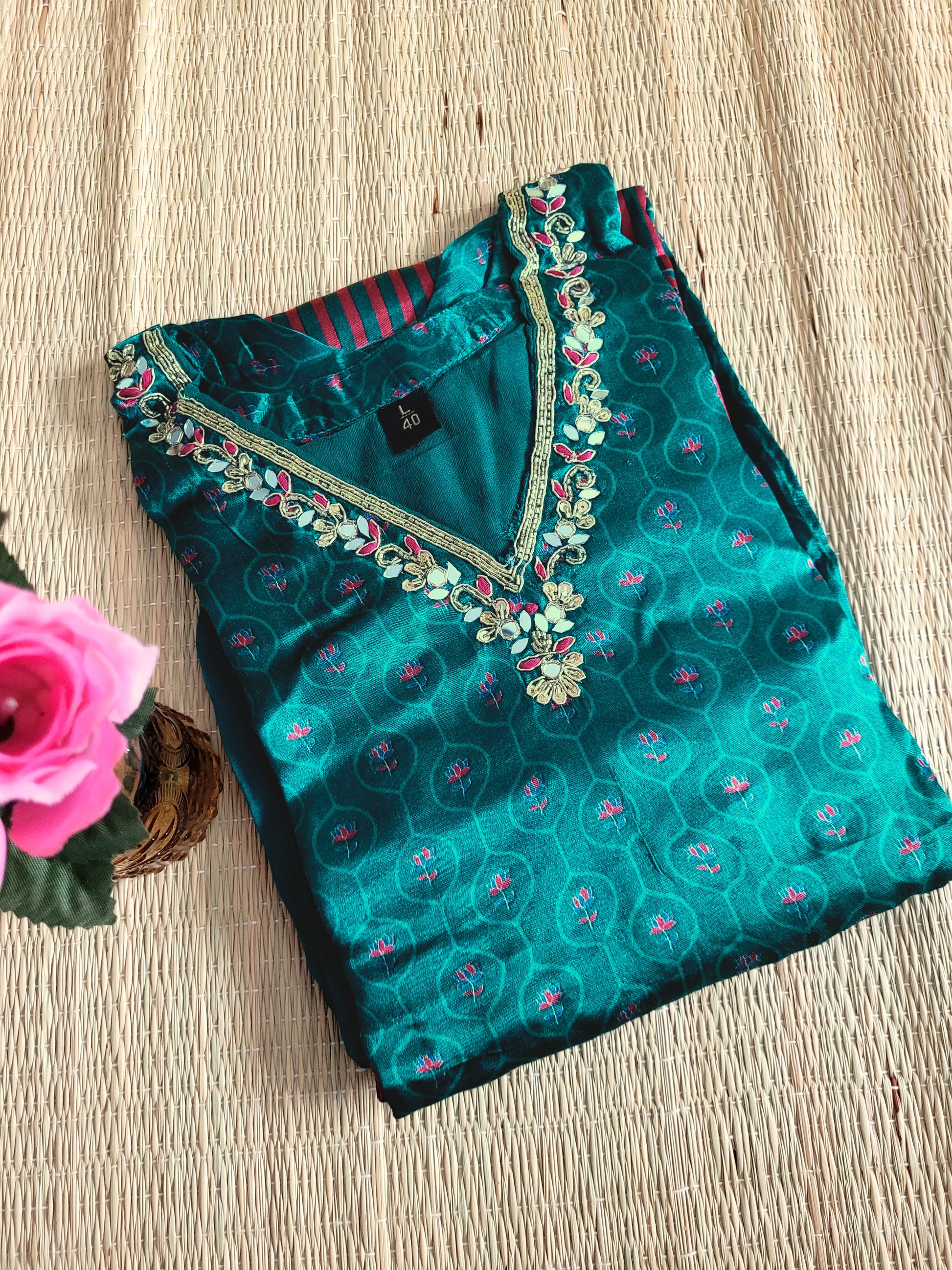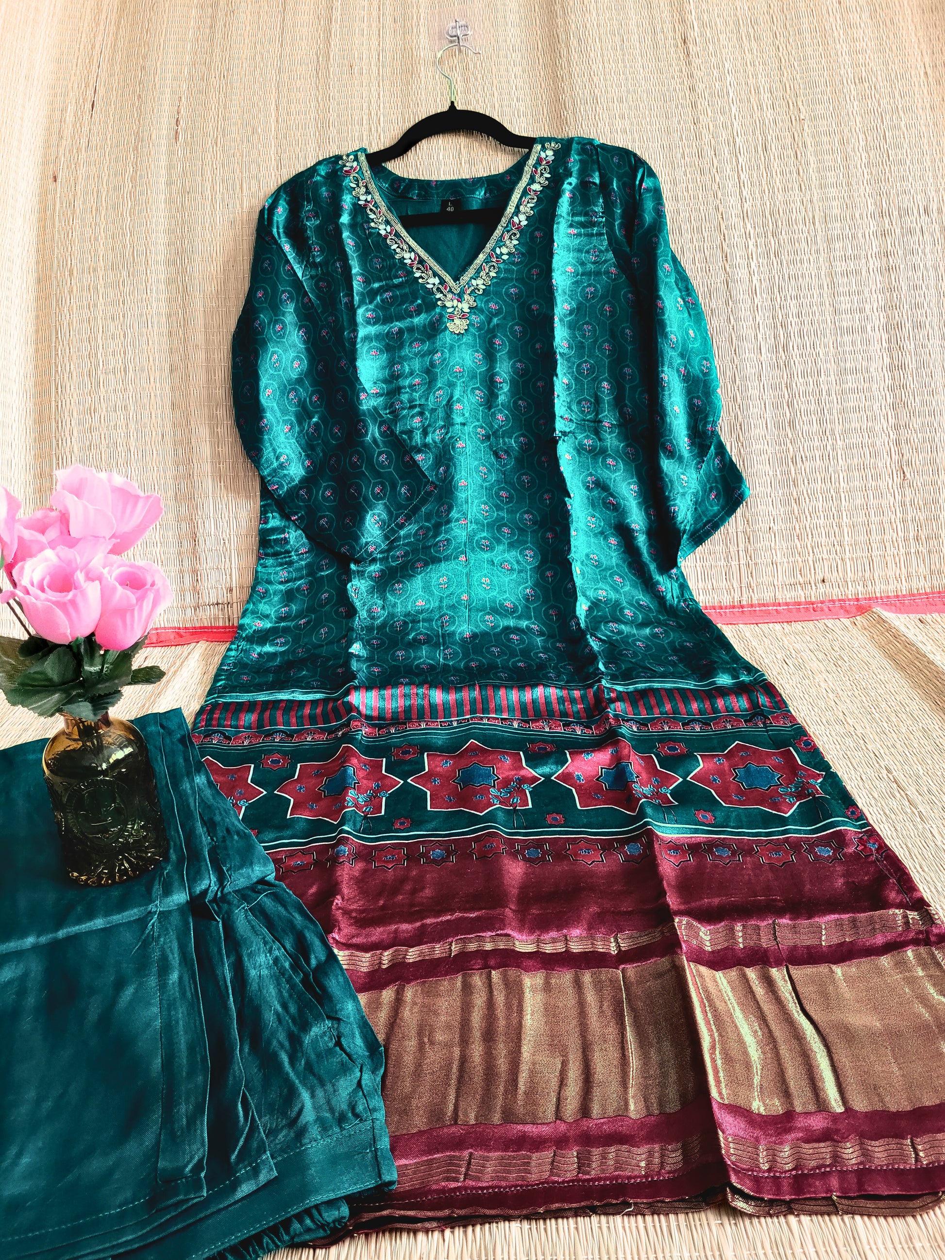 Gaji silk kurti set with ajrakh prints, embroidery over neck and lagda patti border.comes with silk pants. With traditional ajrakh prints, intricate embroidery and a lagda patti border, this set showcases the rich artistry of Indian culture. Paired with soft, elegant silk pants, it's not only a stunning outfit, but also an homage to craftsmanship.