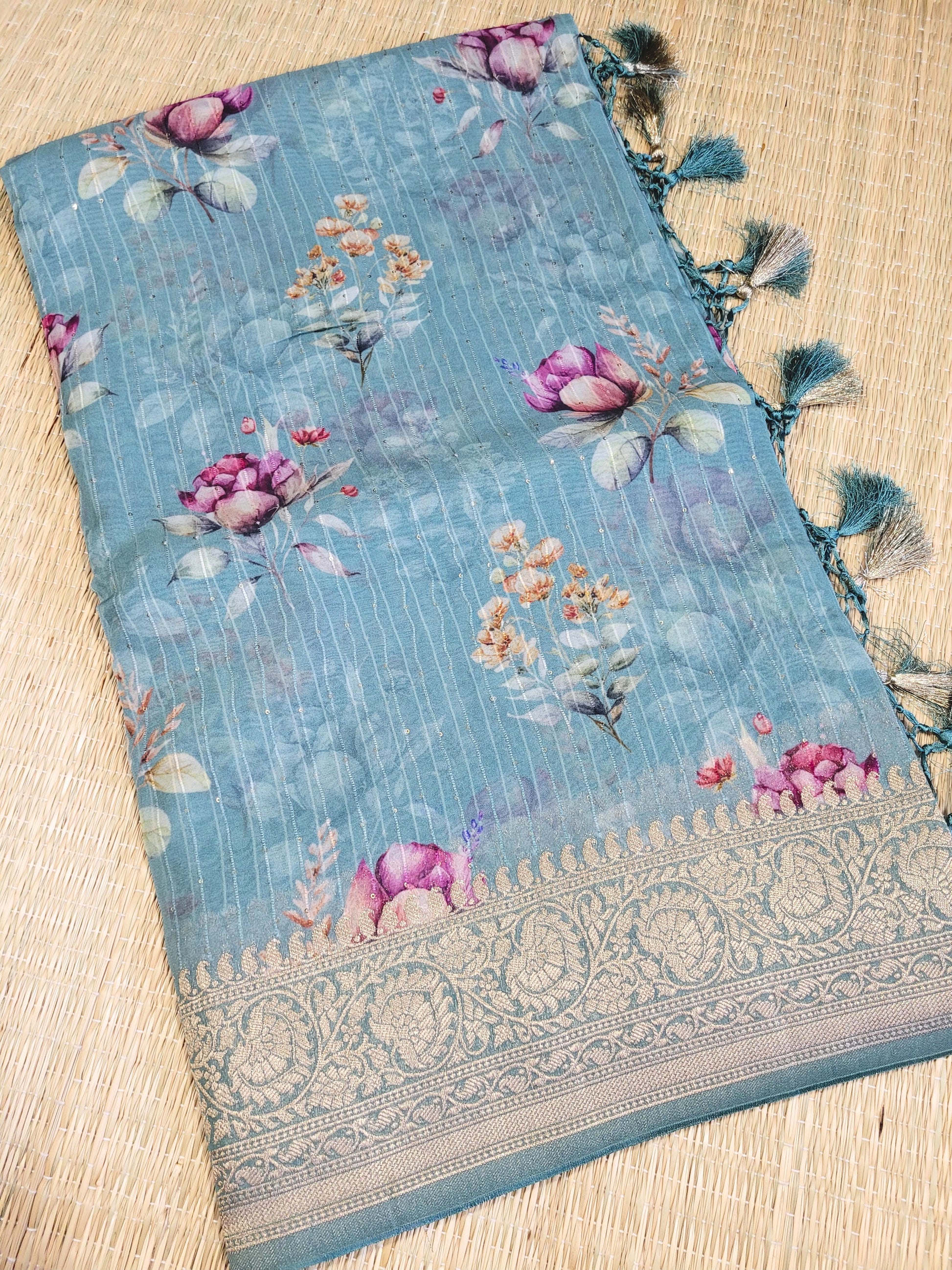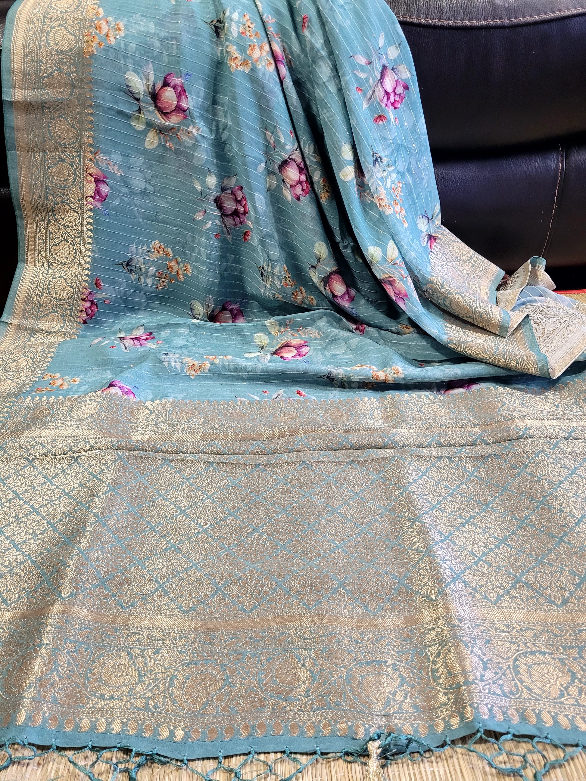 Elevate your wardrobe with this premium georgette saree, featuring elegant all-over floral prints and delicately woven sequins. The look is enhanced with rich Meenakari zari-woven Banarasi borders and a grand intricately designed pallu. Paired with a matching printed blouse piece complete with coordinated borders, this saree brings timeless grace to any occasion