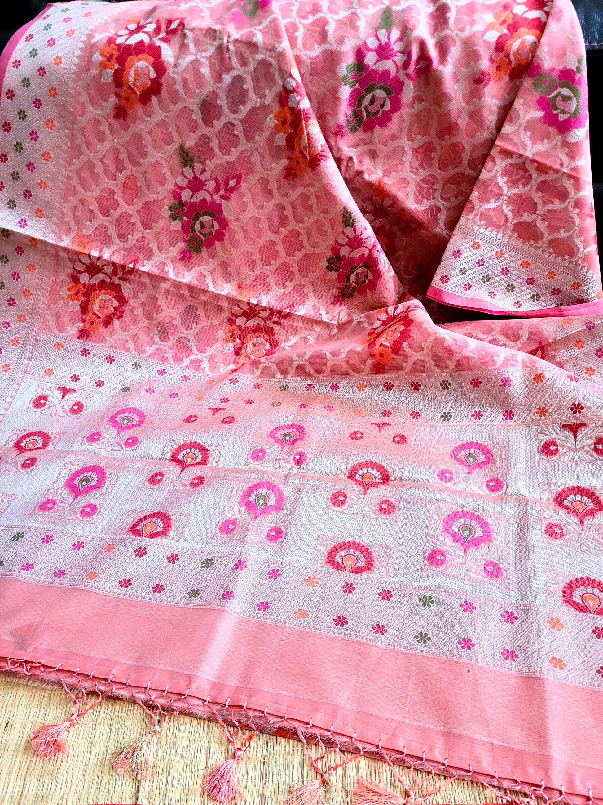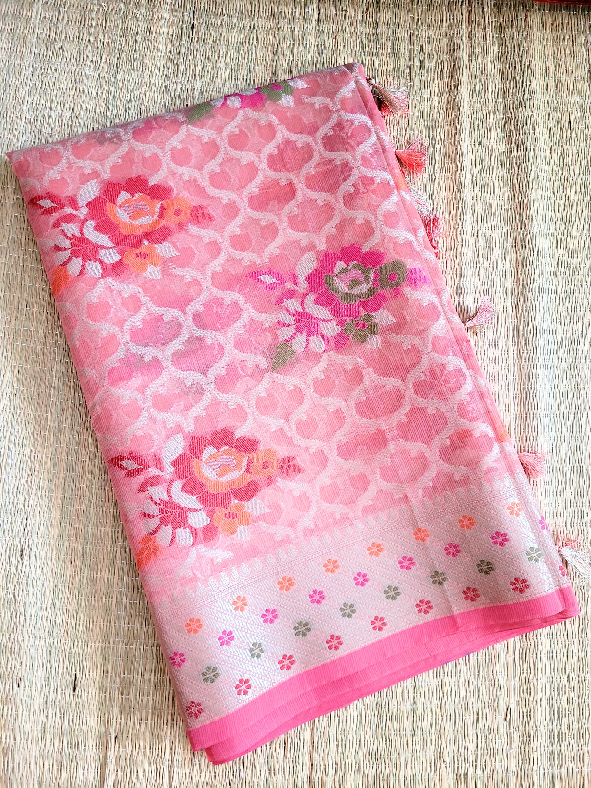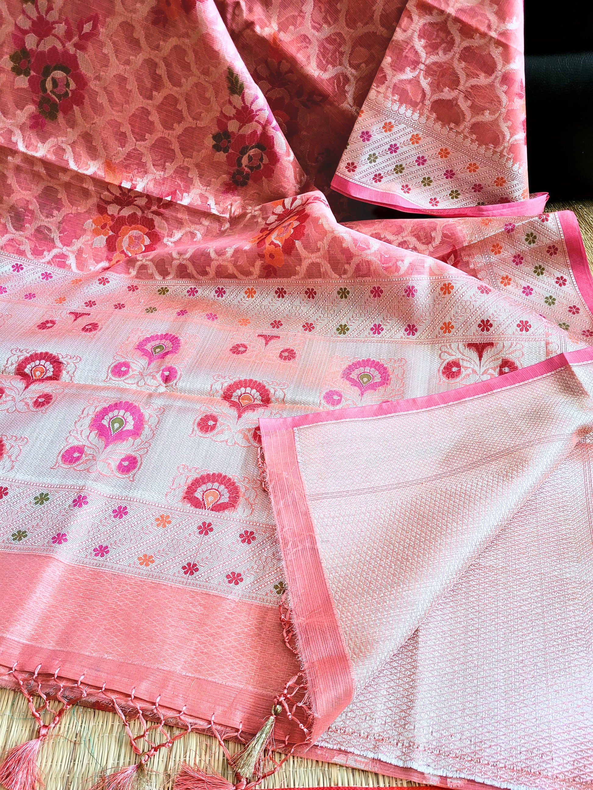 The Banaras Kota saree features intricate jaal weaving throughout the body, adorned with elegant floral motifs woven from delicate thread. The borders are embellished with stunning silver thread, and the saree is completed with a grand pallu. A brocade blouse piece is included for a complete and luxurious look.