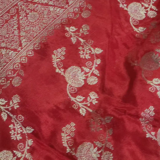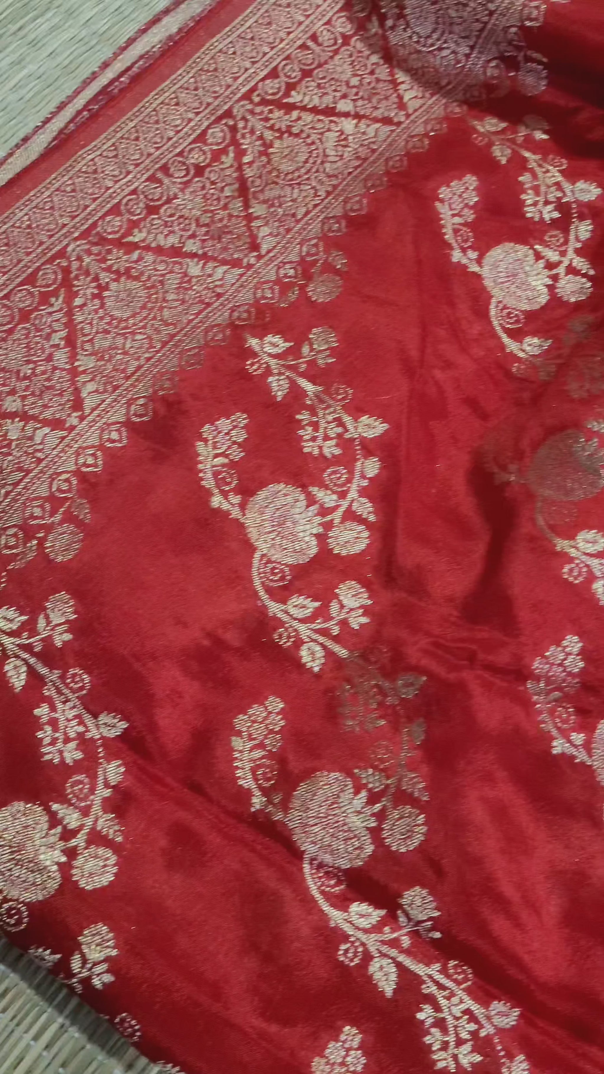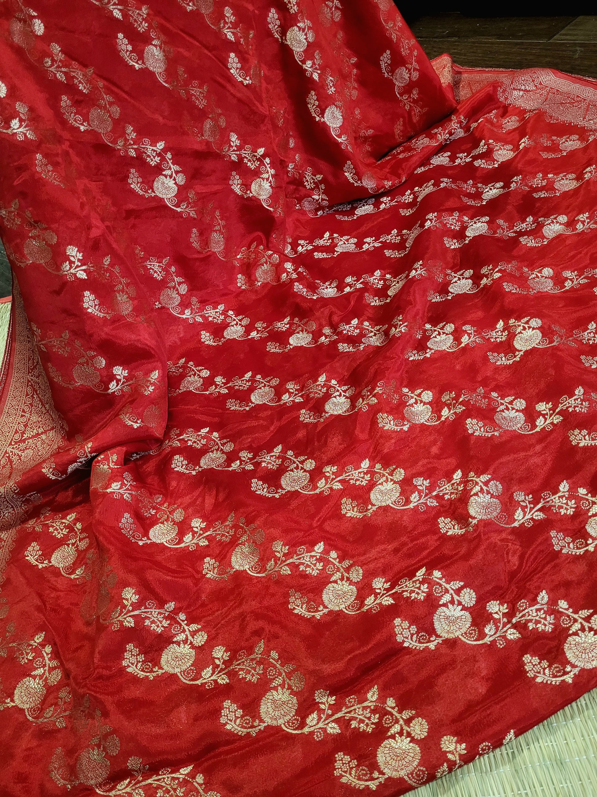 This tomato red satin mushru saree features Banarasi borders on both sides, along with a grand woven pallu. The saree showcases a creeper jaal weaving all over the body and comes with a stitched lining blouse