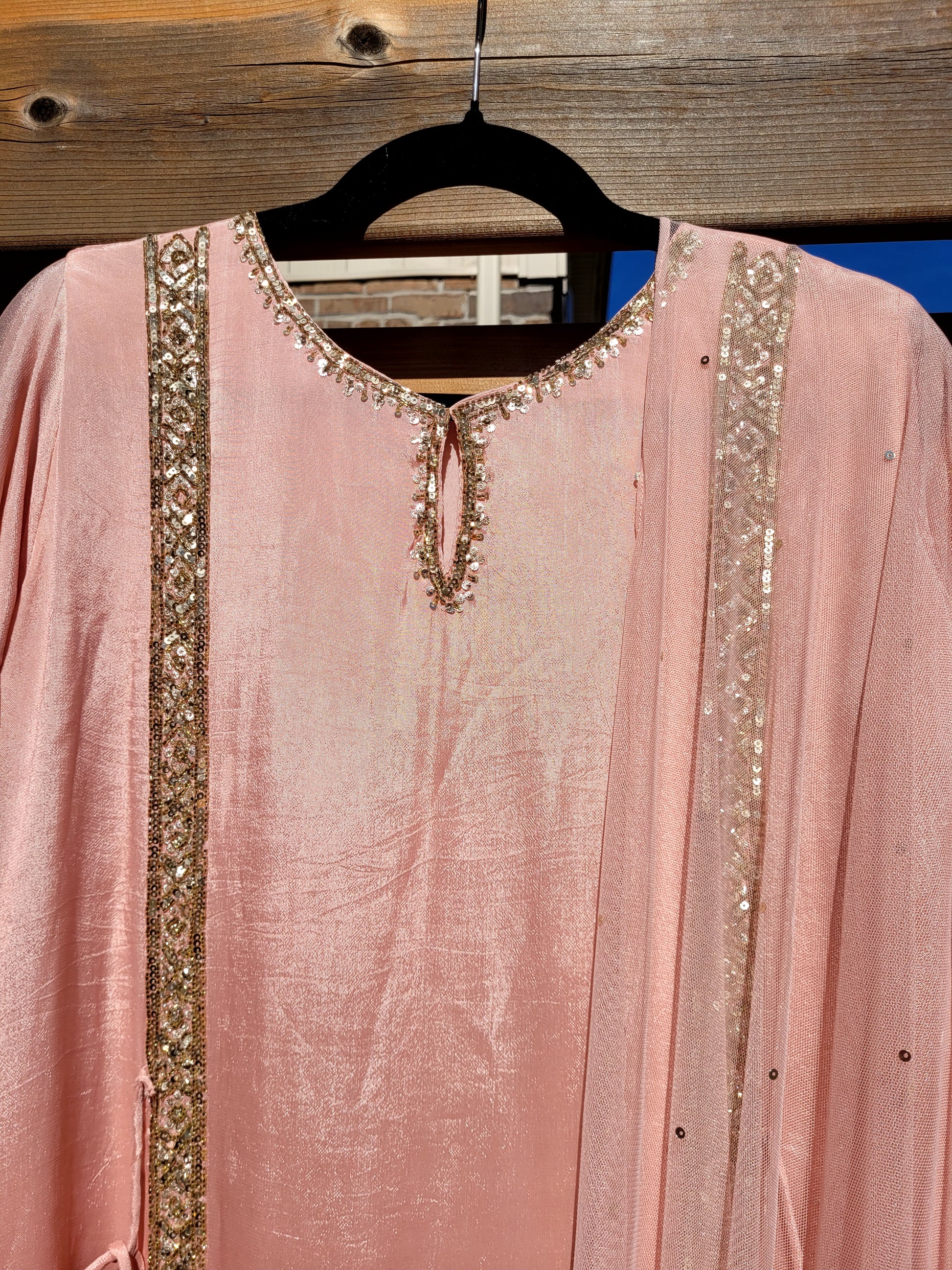 This Chinon crepe salwar set features intricate hand embroidery and a knee-length kurti for a flattering fit. The dothi-style pants come with an adjustable waist, and the high-quality stitching and inner lining ensure durability. Complete the bollywood-style party look with the included net dupatta. Perfect for any occasion, this set is a must-have for those who appreciate quality and style.