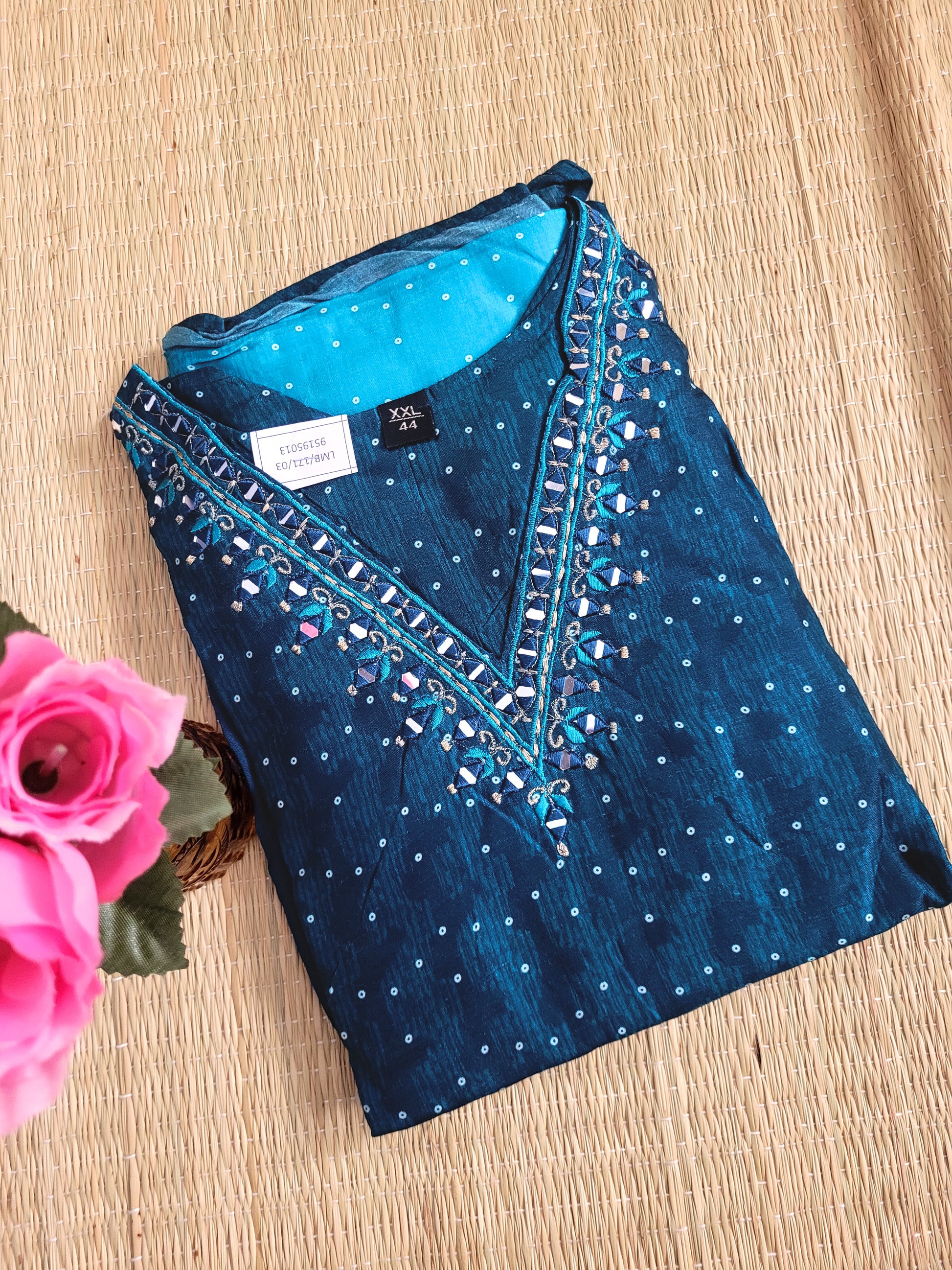 Crafted with soft, high-quality crepe and intricate embroidery, this Salwar is both stylish and comfortable. The bandhani print adds a unique touch to the neck and top, while the included pant and dupatta complete the set for a versatile outfit. Perfect for any occasion, this Salwar guarantees both fashion and functionality. With a lined top and plain pant, it's easy to see why this set is a must-have for any wardrobe.
