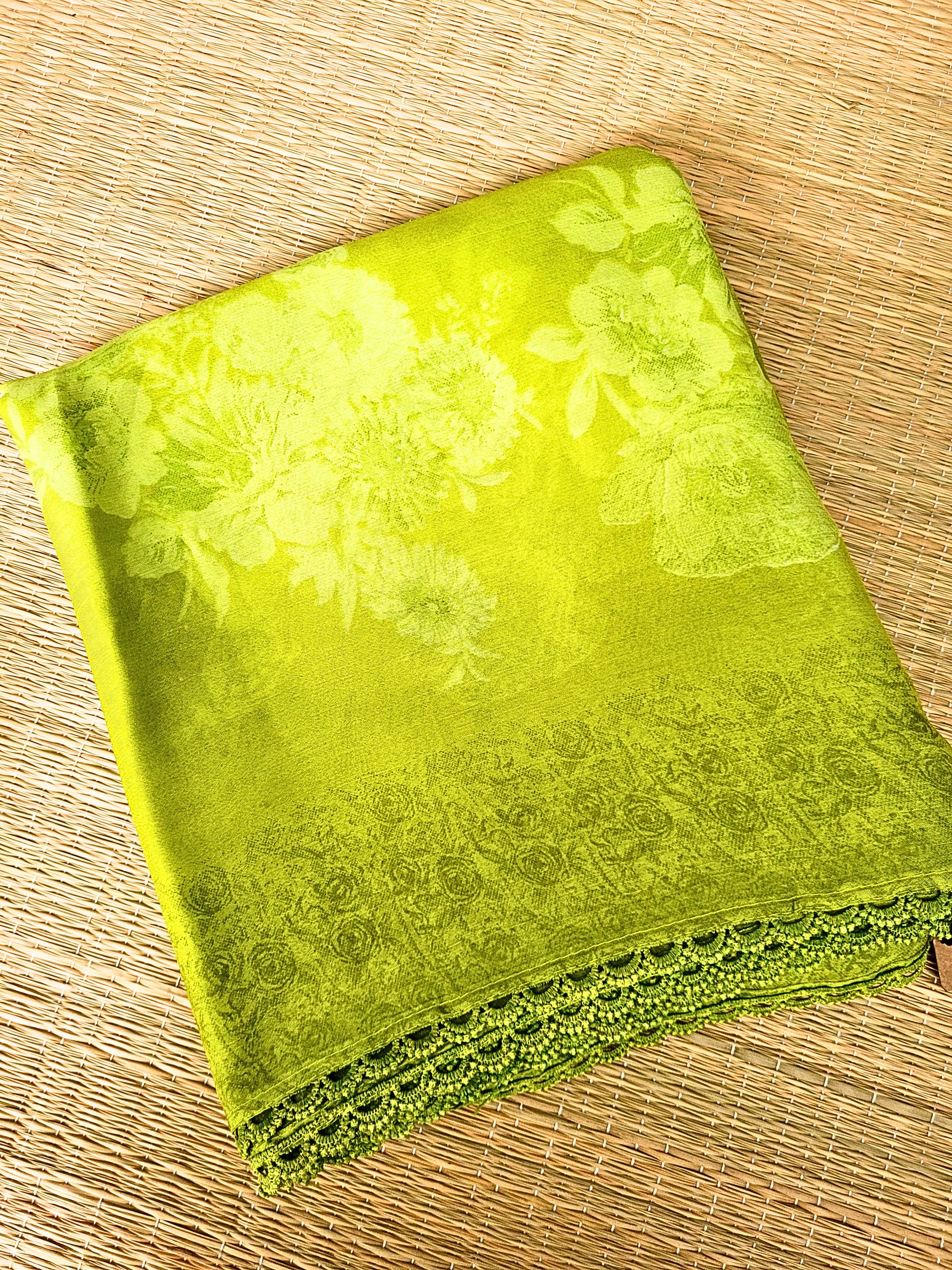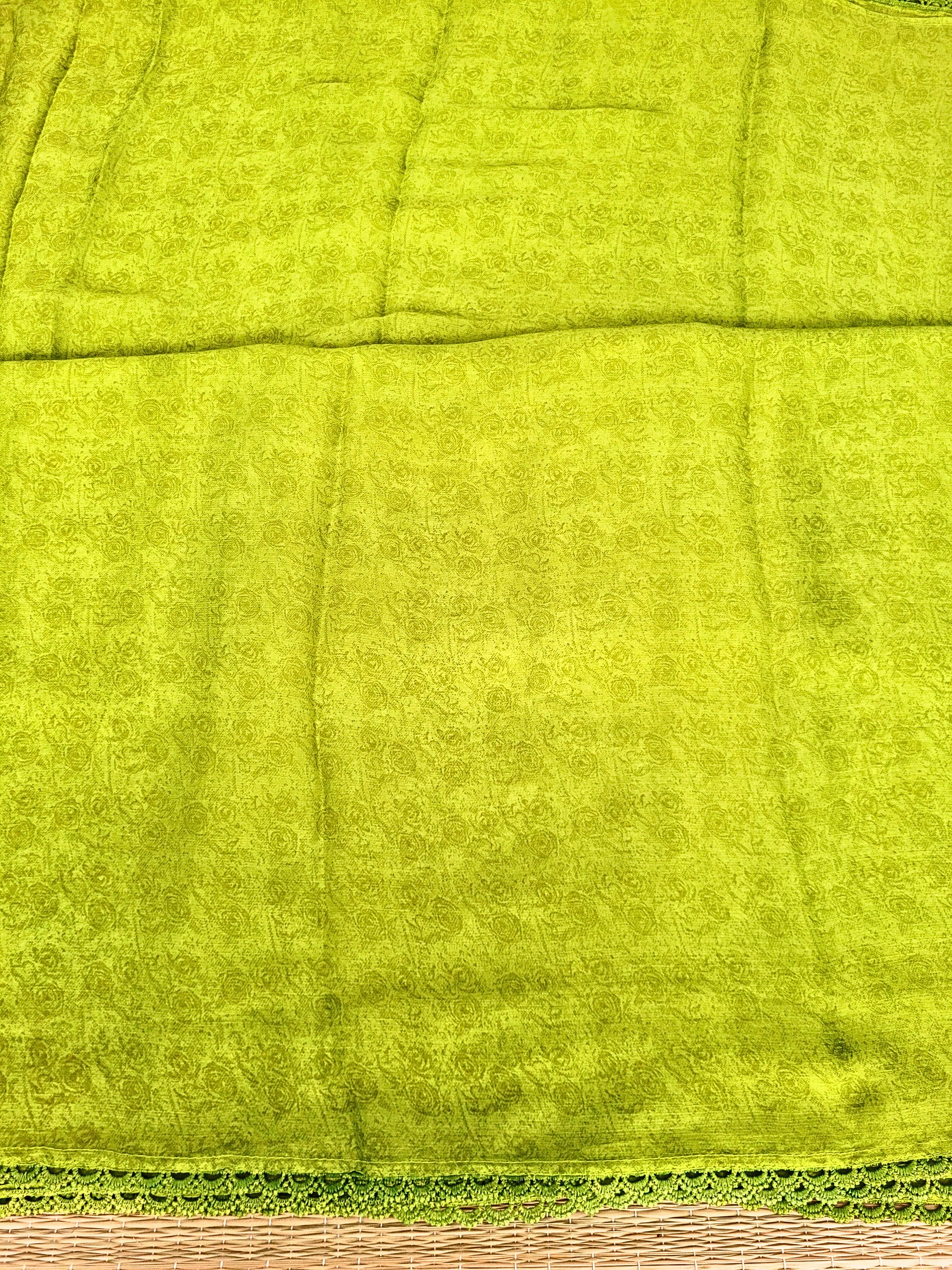 Good quality georgette printed saree with scallop lace border. Comes with contrast printed blouse.