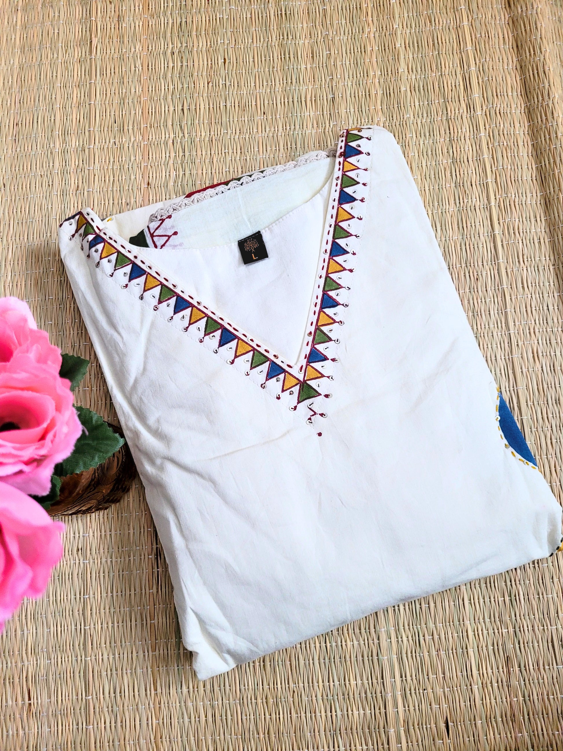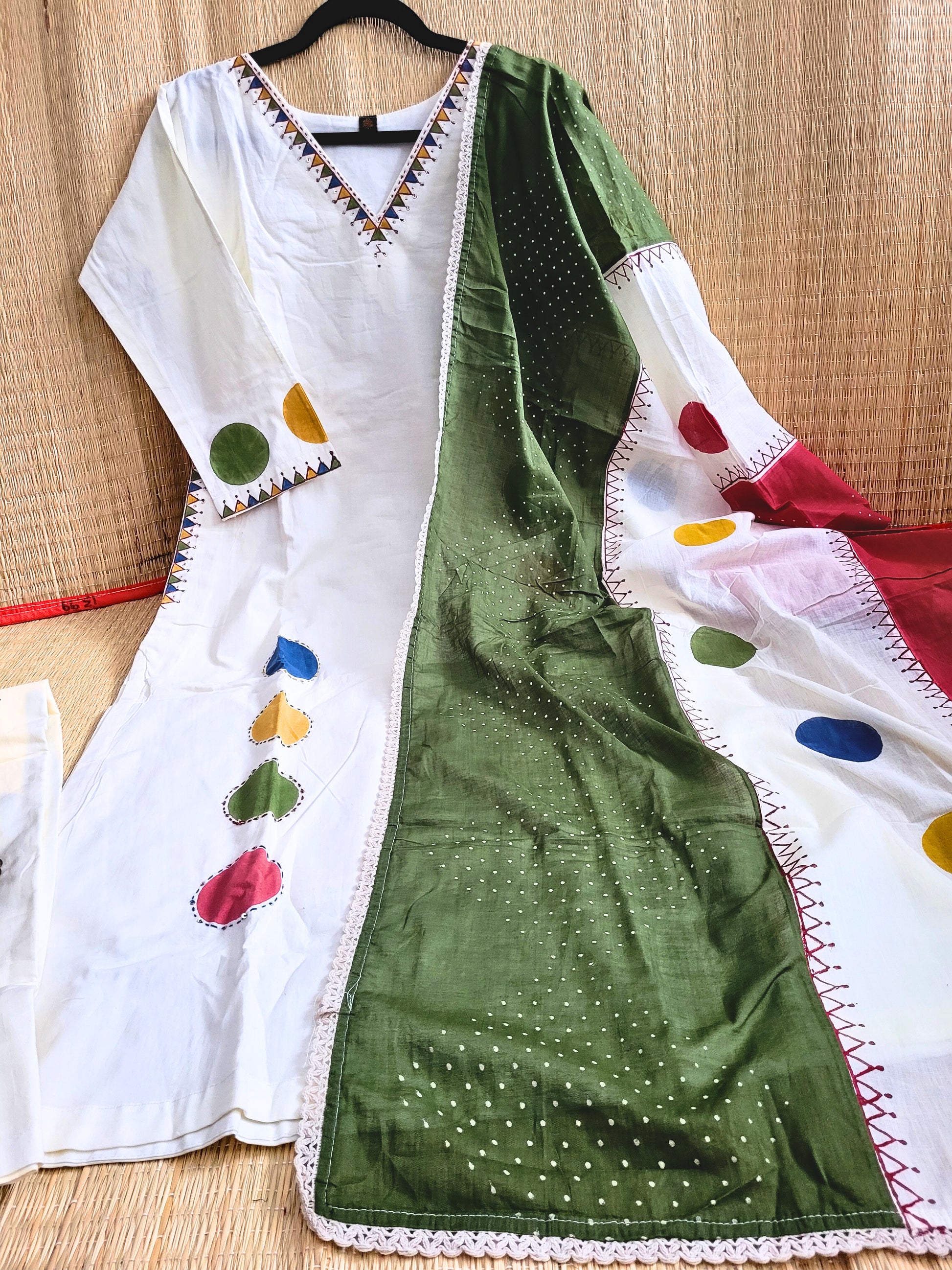 Experience ultimate comfort and timeless style with this 100% khadi cotton dress. The geometric block prints and hand Katha work create a sophisticated aesthetic. The inner lining ensures a comfortable fit, while the plain pants and colorful dupatta add versatility to your wardrobe.