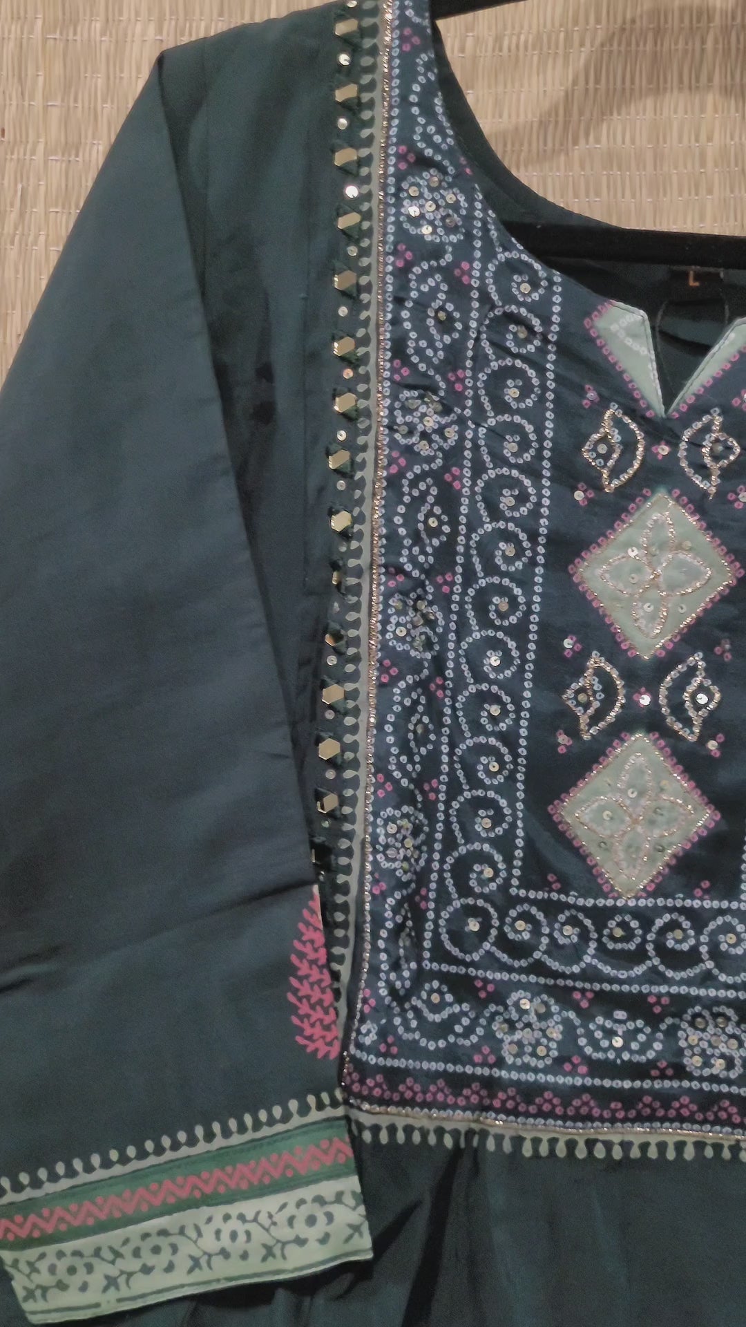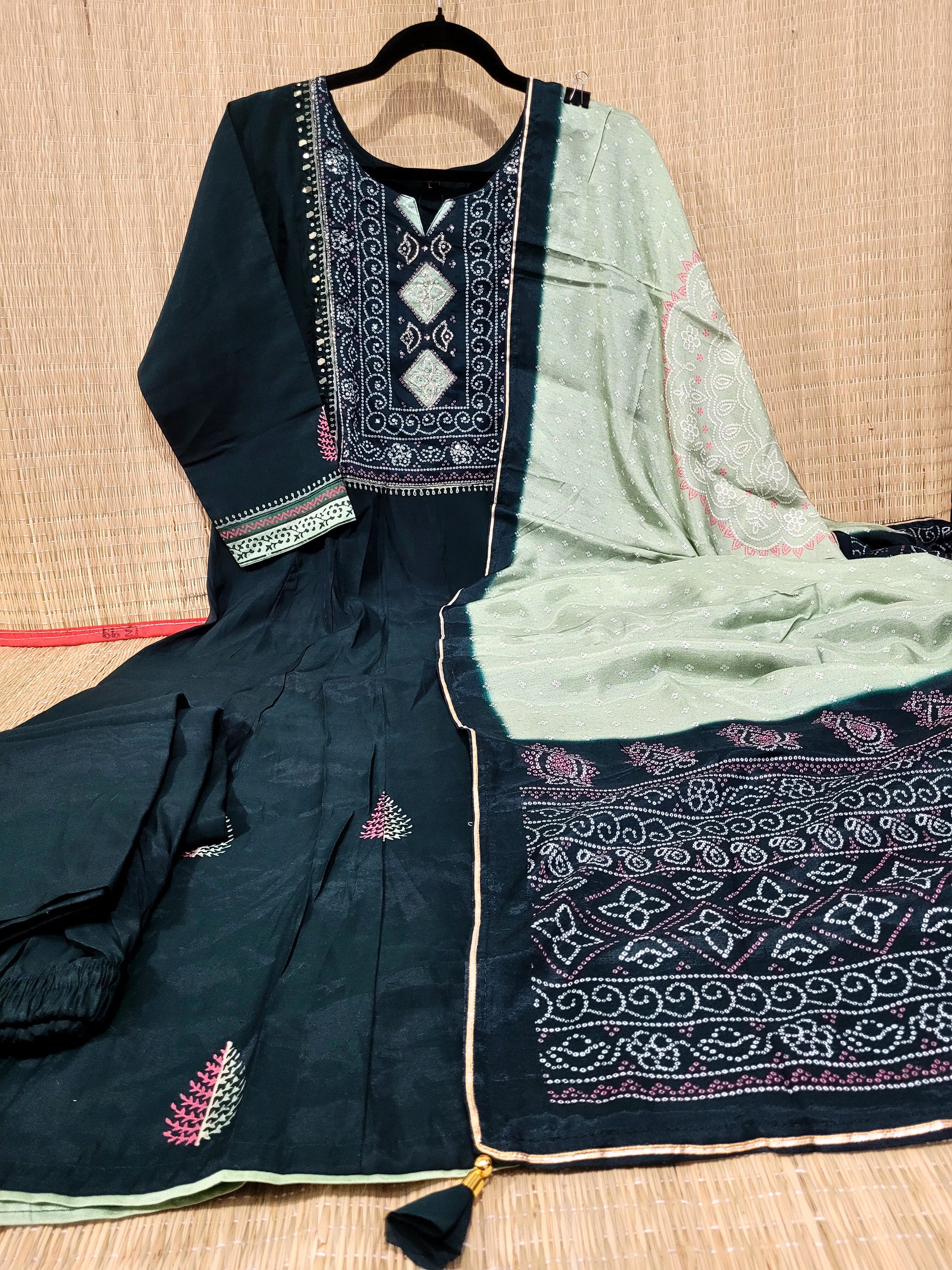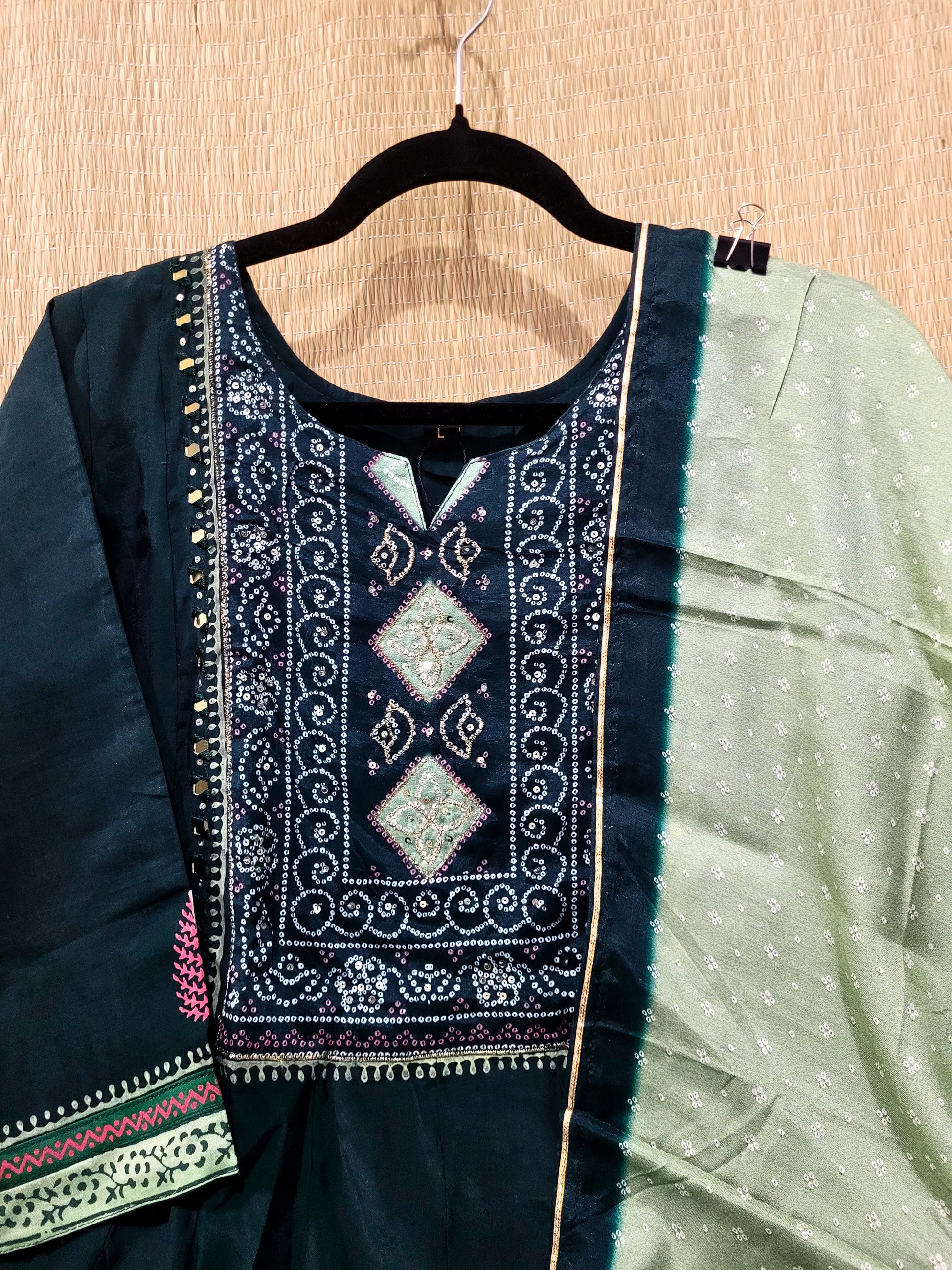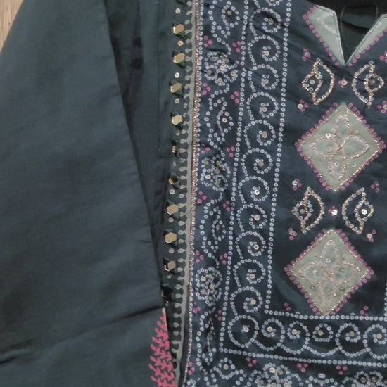 Muslin salwar suit with bandhani print on kurti and detailed embroidery and mirror work over hem. Comes with plain pant and printed dupatta. Made from high-quality muslin fabric, this salwar suit features a traditional bandhani print on the kurti, detailed embroidery, and intricate mirror work on the hem. The set also includes a plain pant and a beautifully printed dupatta. Elevate your wardrobe with this stylish and culturally-rich ensemble.