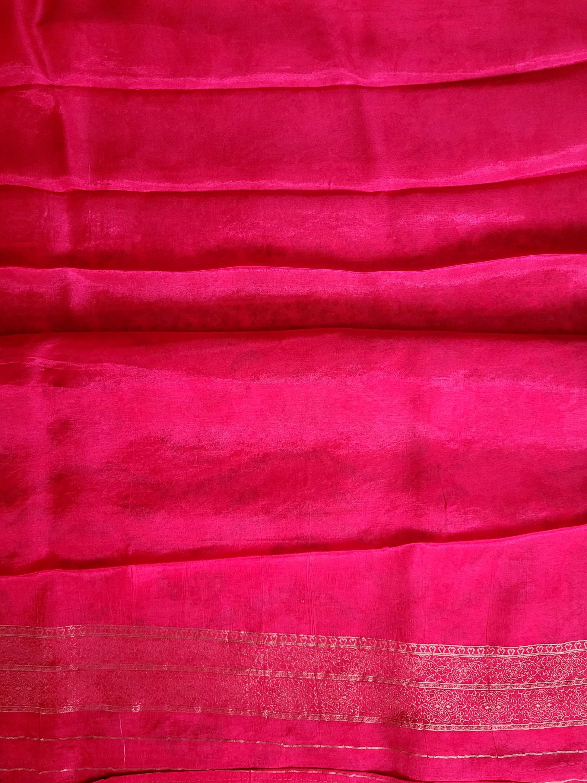 This silk saree showcases intricate Kashmir weaving, with vibrant silk threads and zari. Both sides feature heavy woven borders and a grand pallu, while the body is adorned with creeper and mango butta patterns. This results in an exclusive, one-of-a-kind saree that is sure to stand out.