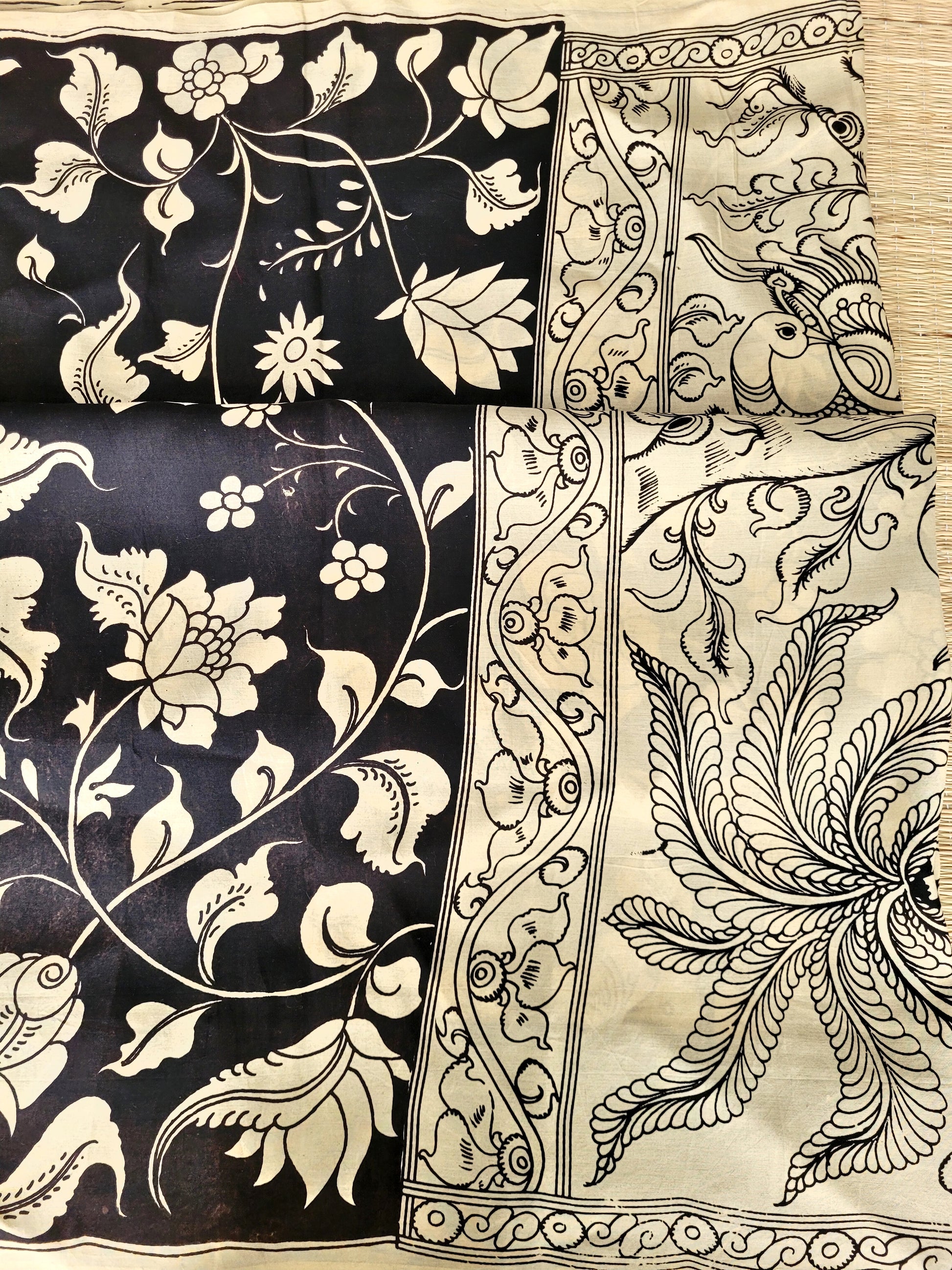 This exquisite Chennuri silk saree features a beautiful forest theme with hand-painted Kalamkari designs, showcasing animals and creepers throughout the body and pallu.