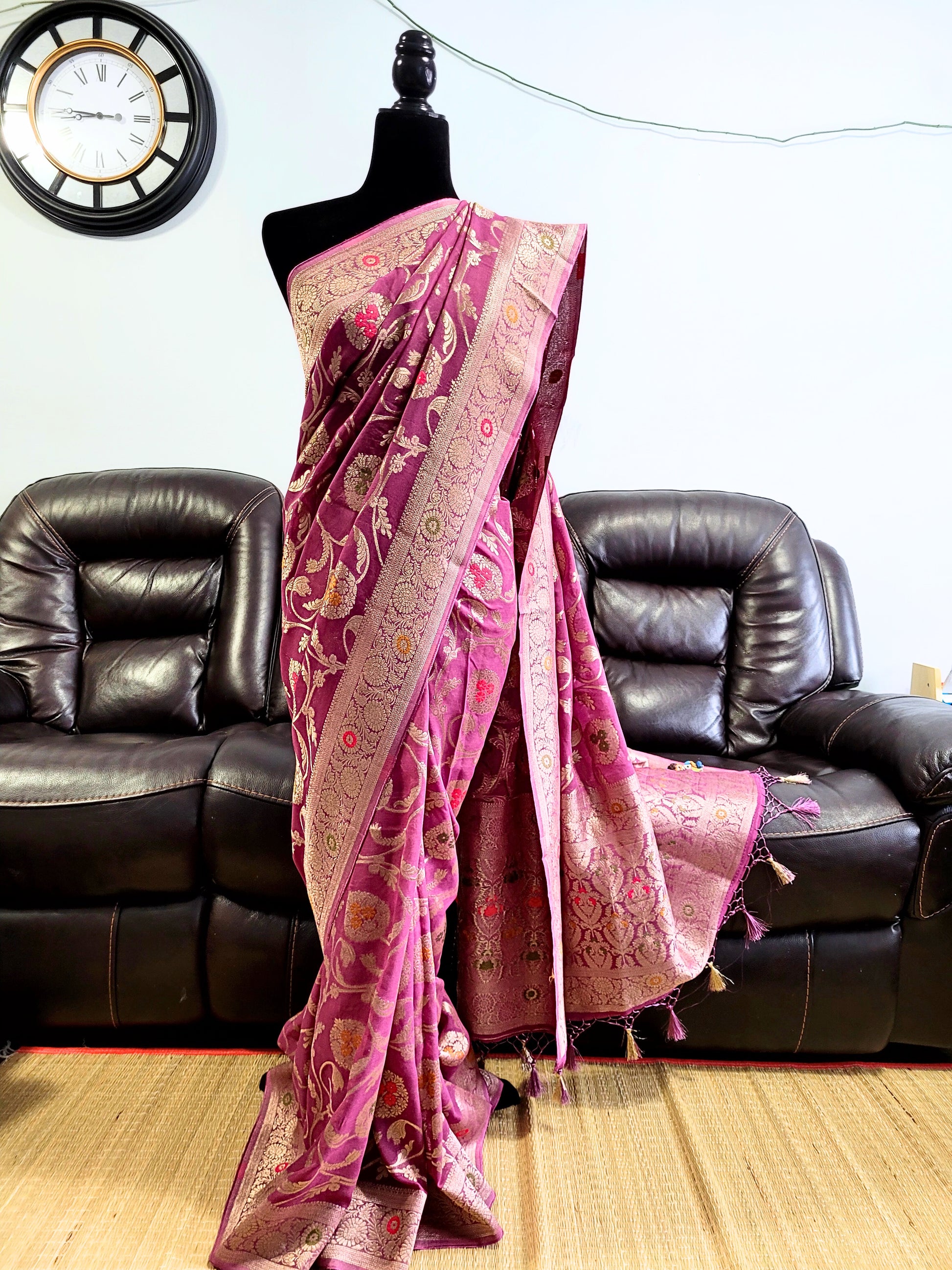 This premium Khadi Banaras Georgette Saree features exquisite Meenakari Zari weaving throughout the body, with elegant borders on both sides and a stunning woven pallu. The saree also includes a plain blouse piece with matching borders for the sleeves