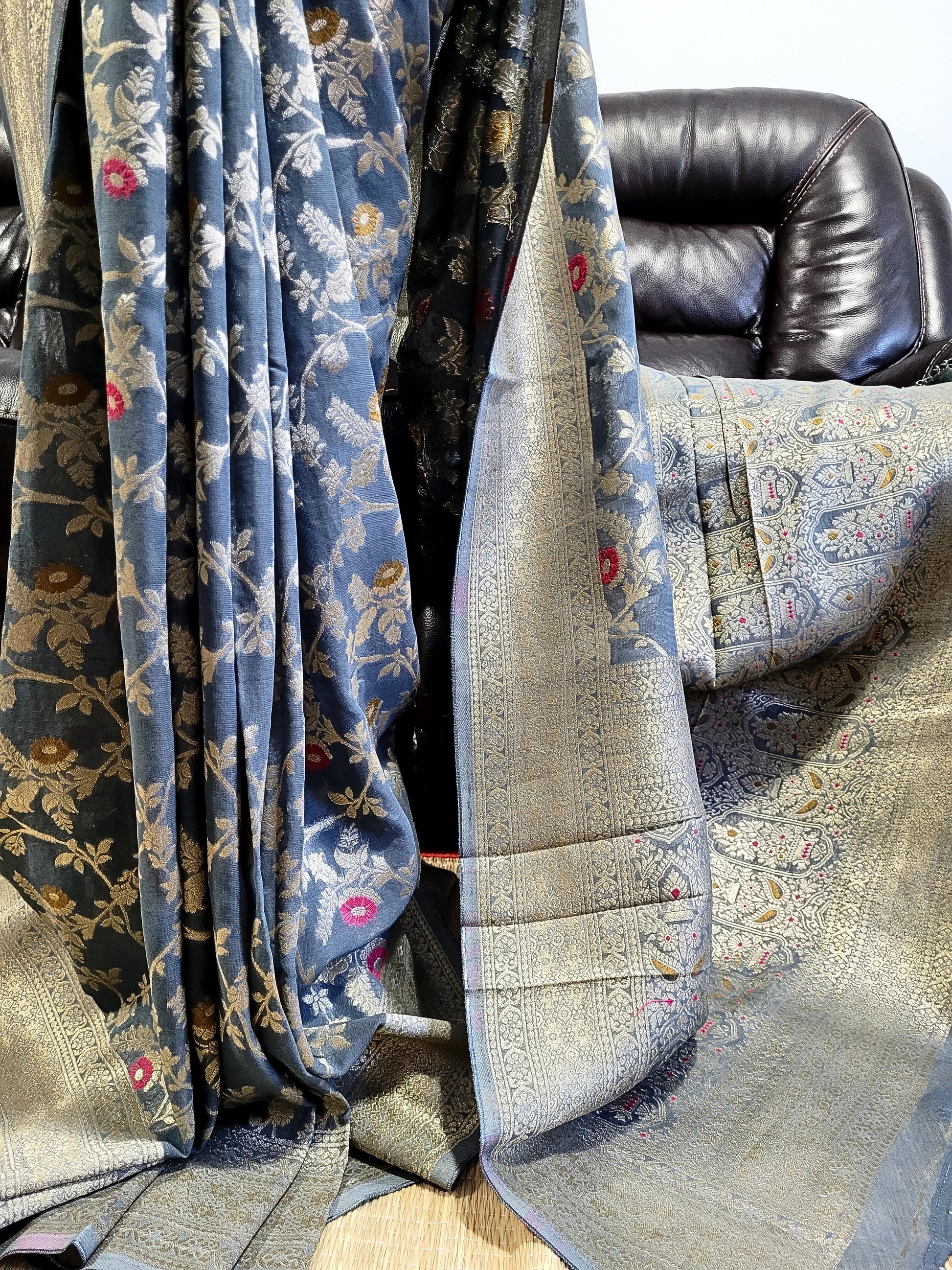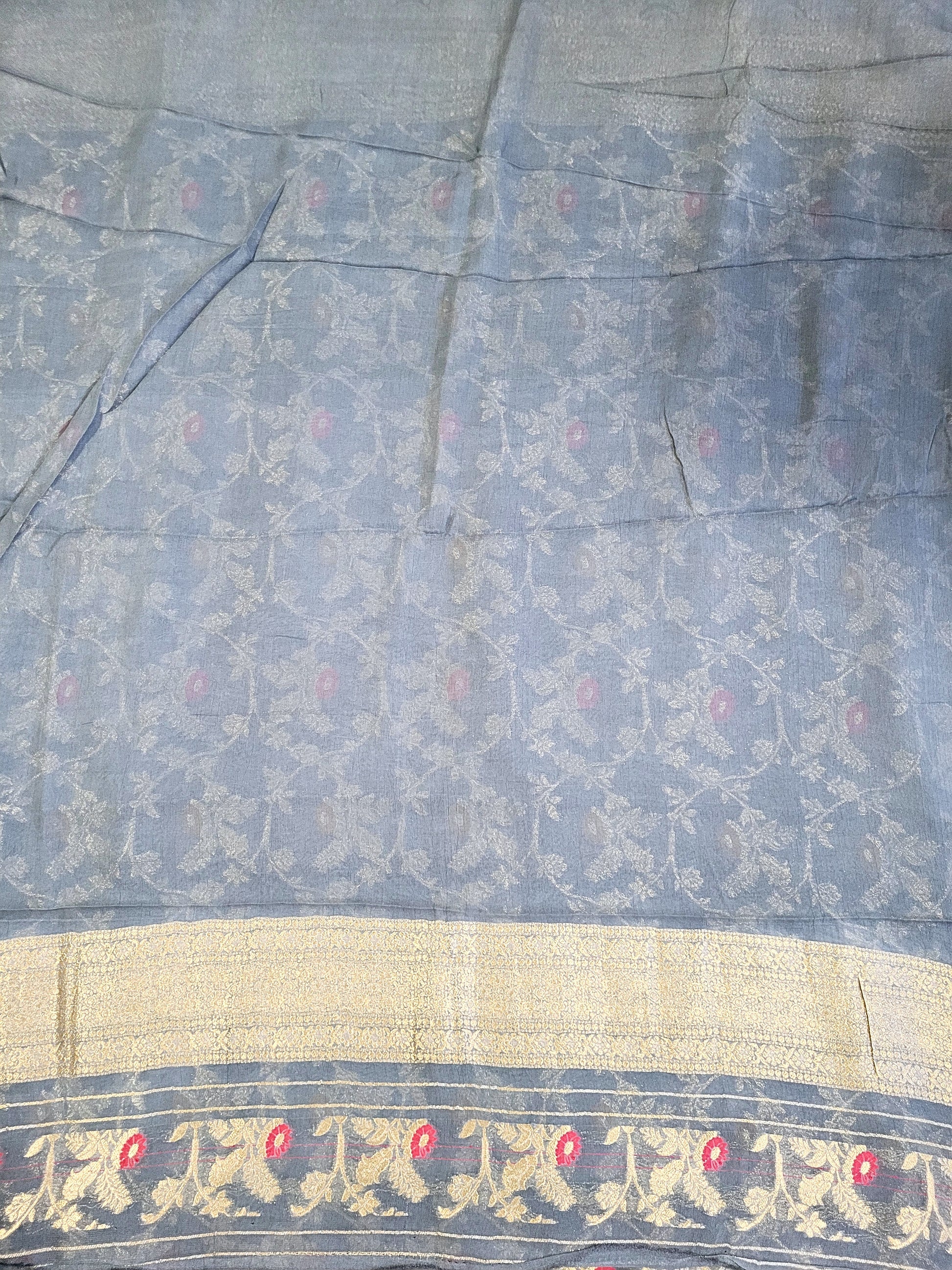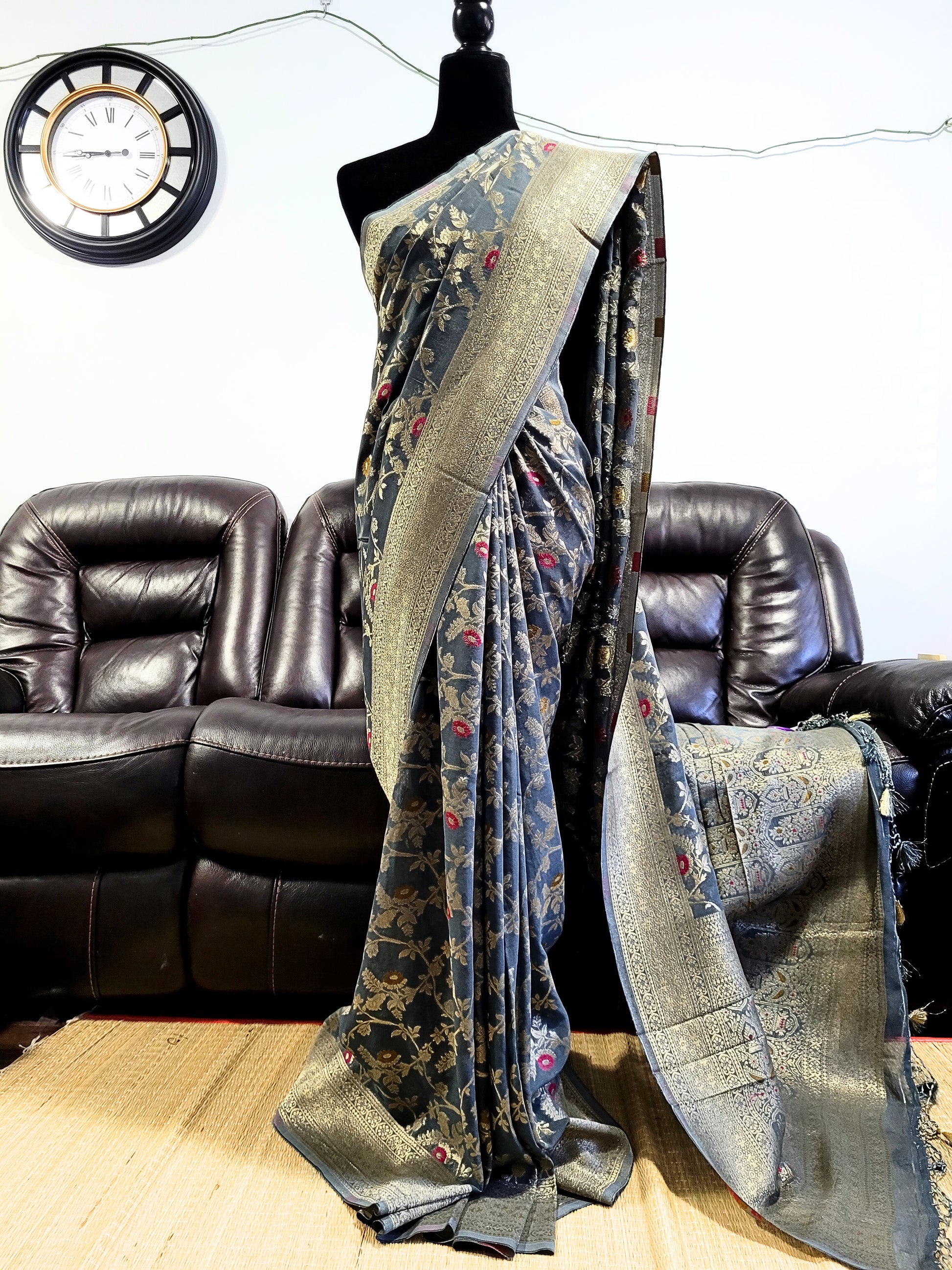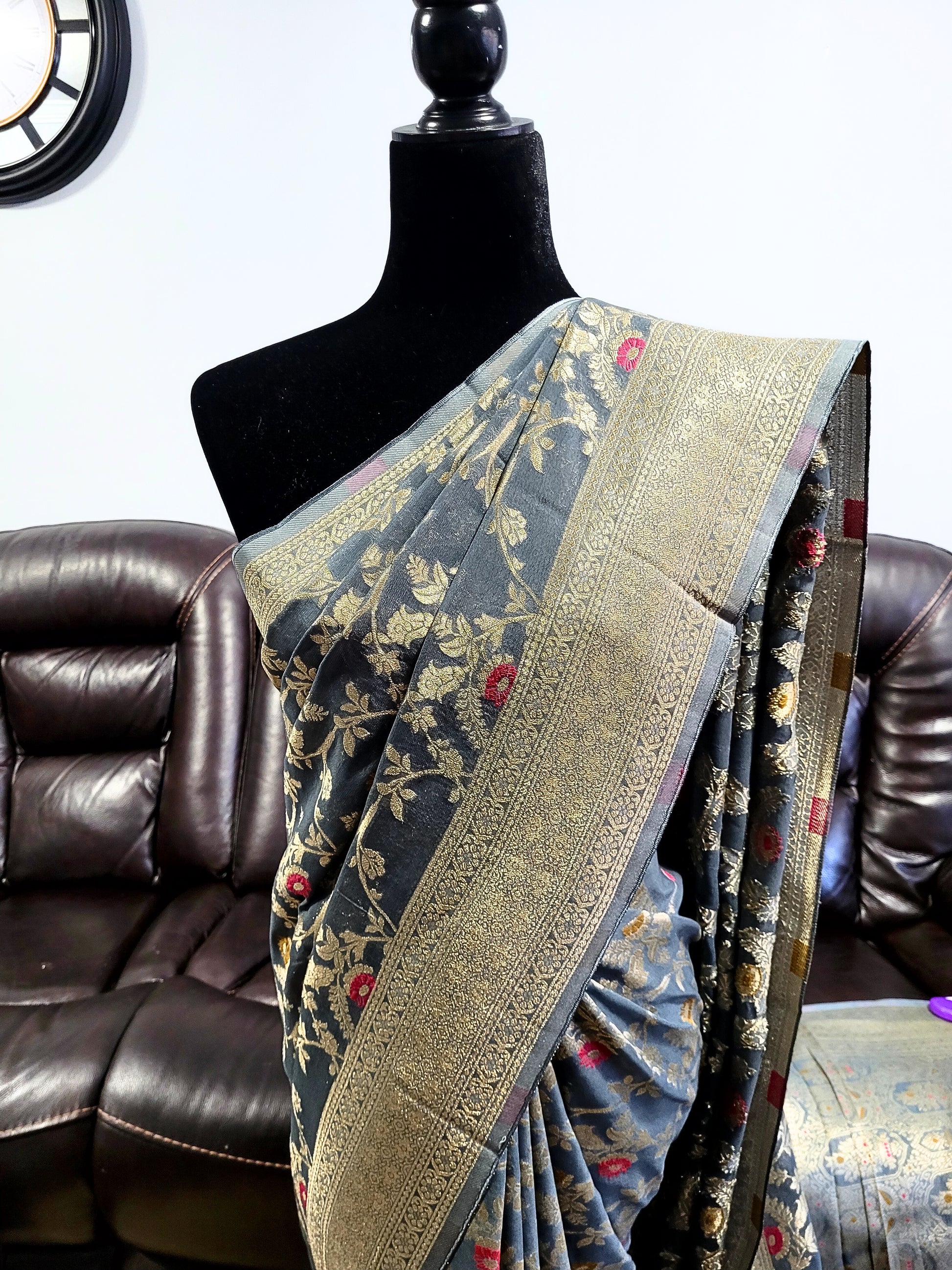 This premium Khadi Banaras Georgette Saree features exquisite Meenakari Zari weaving throughout the body, with elegant borders on both sides and a stunning woven pallu. The saree also includes a plain blouse piece with matching borders for the sleeves