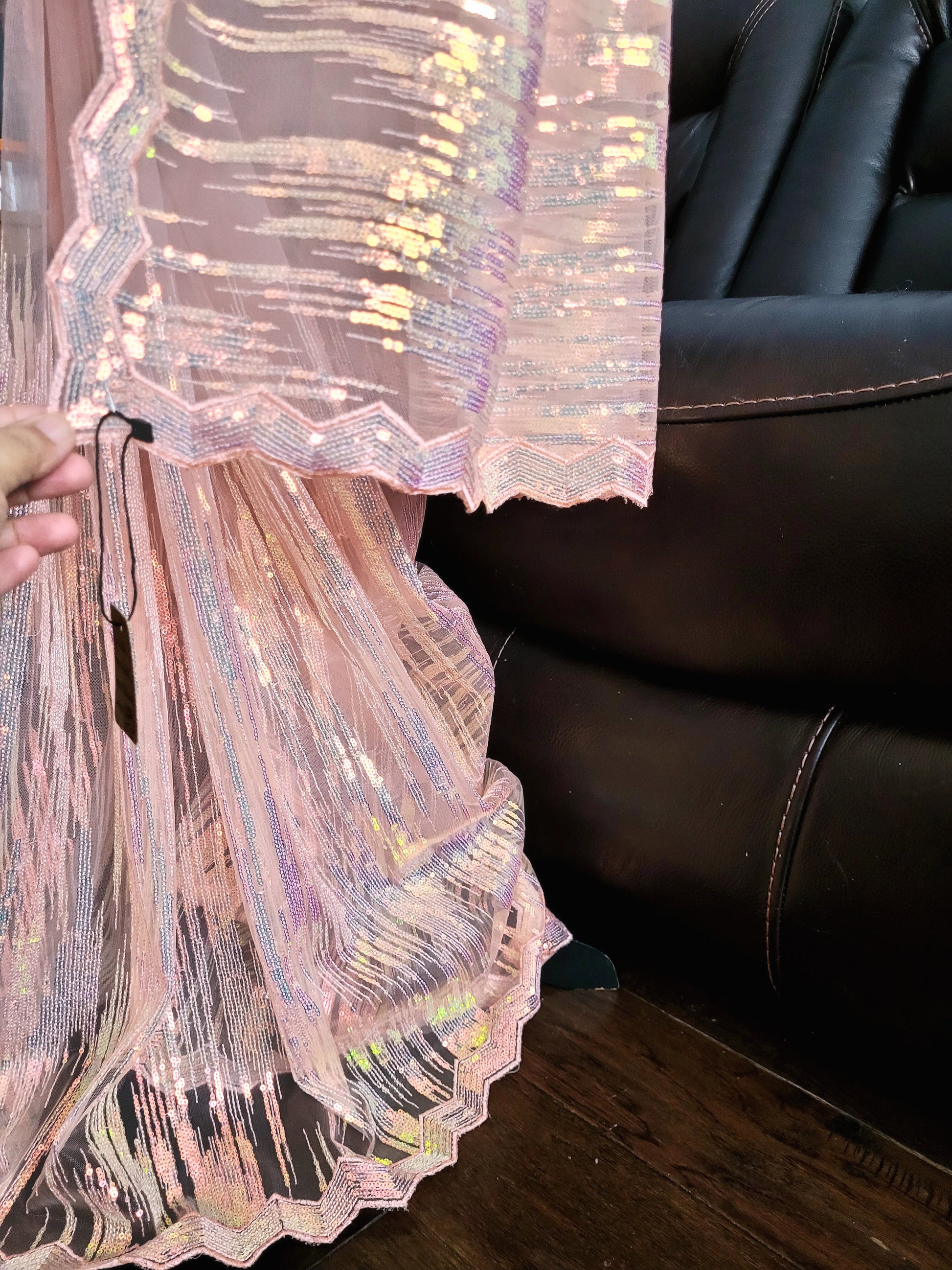 Elevate your ethnic wear collection with this premium net saree in peach, featuring patterned sequins embroidery. The scallop borders with sequins work add a touch of elegance, making it perfect for special occasions. The blouse piece is equally stunning with heavy sequins work, creating a cohesive look. Get ready to turn heads with this must-have piece.