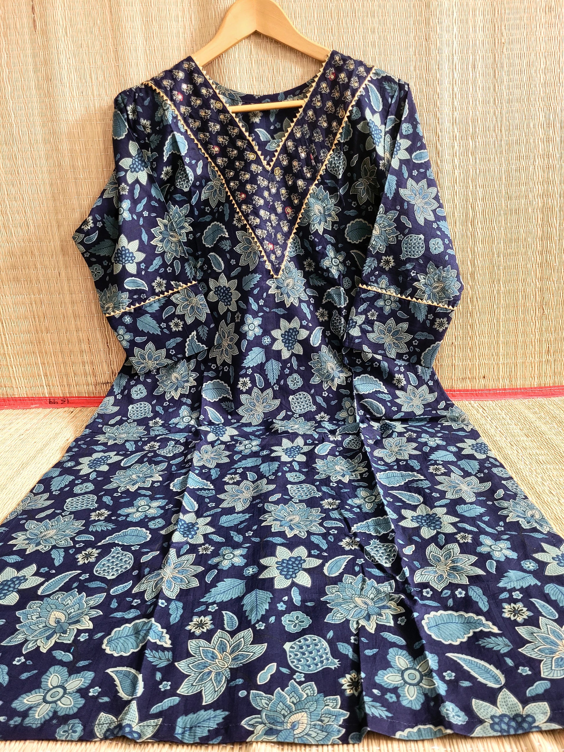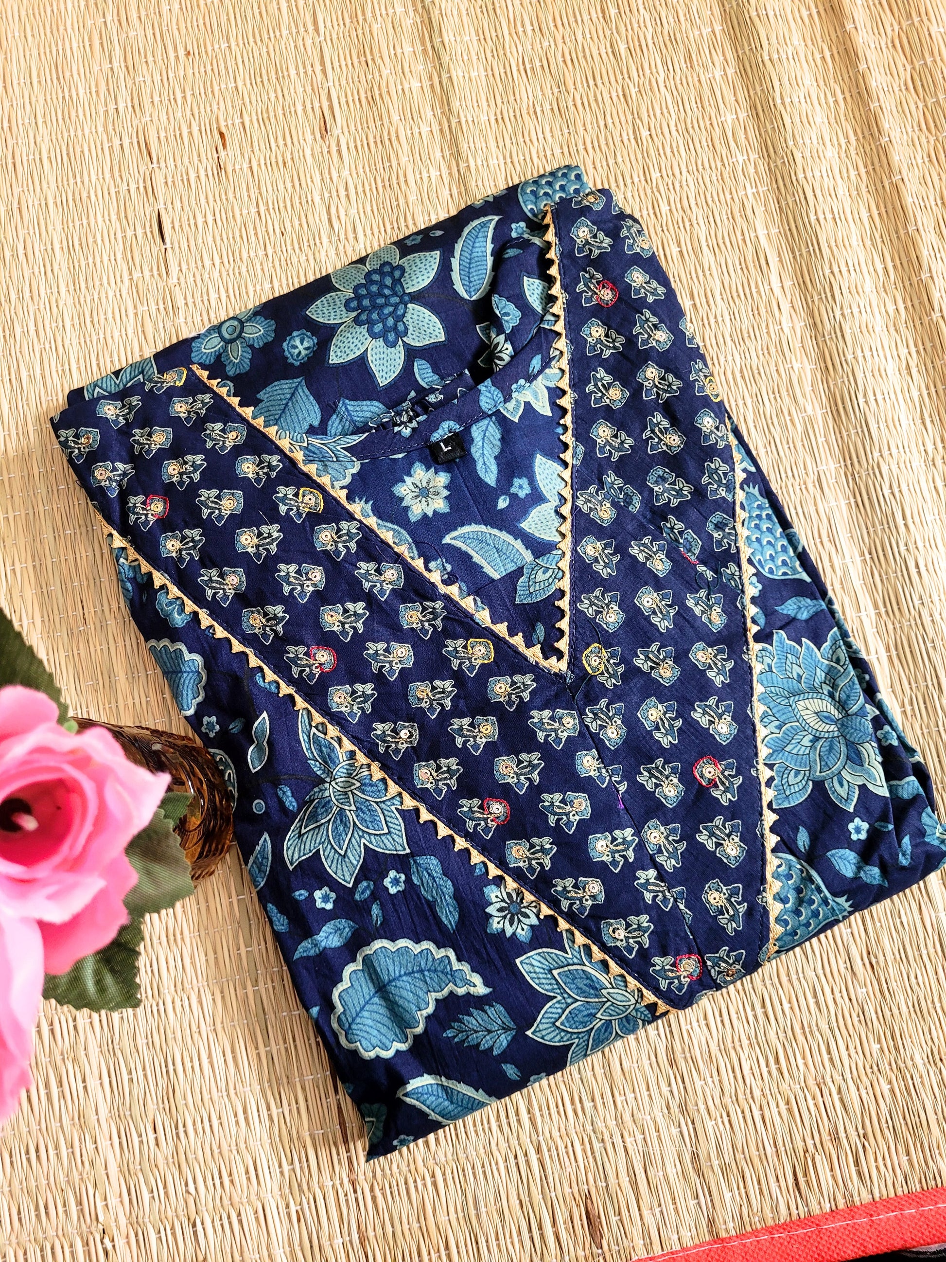 The Printed Cotton Co-ord Set features an elegant print and delicate embroidery on the neckline. It is complemented by a pair of contrast printed pants
