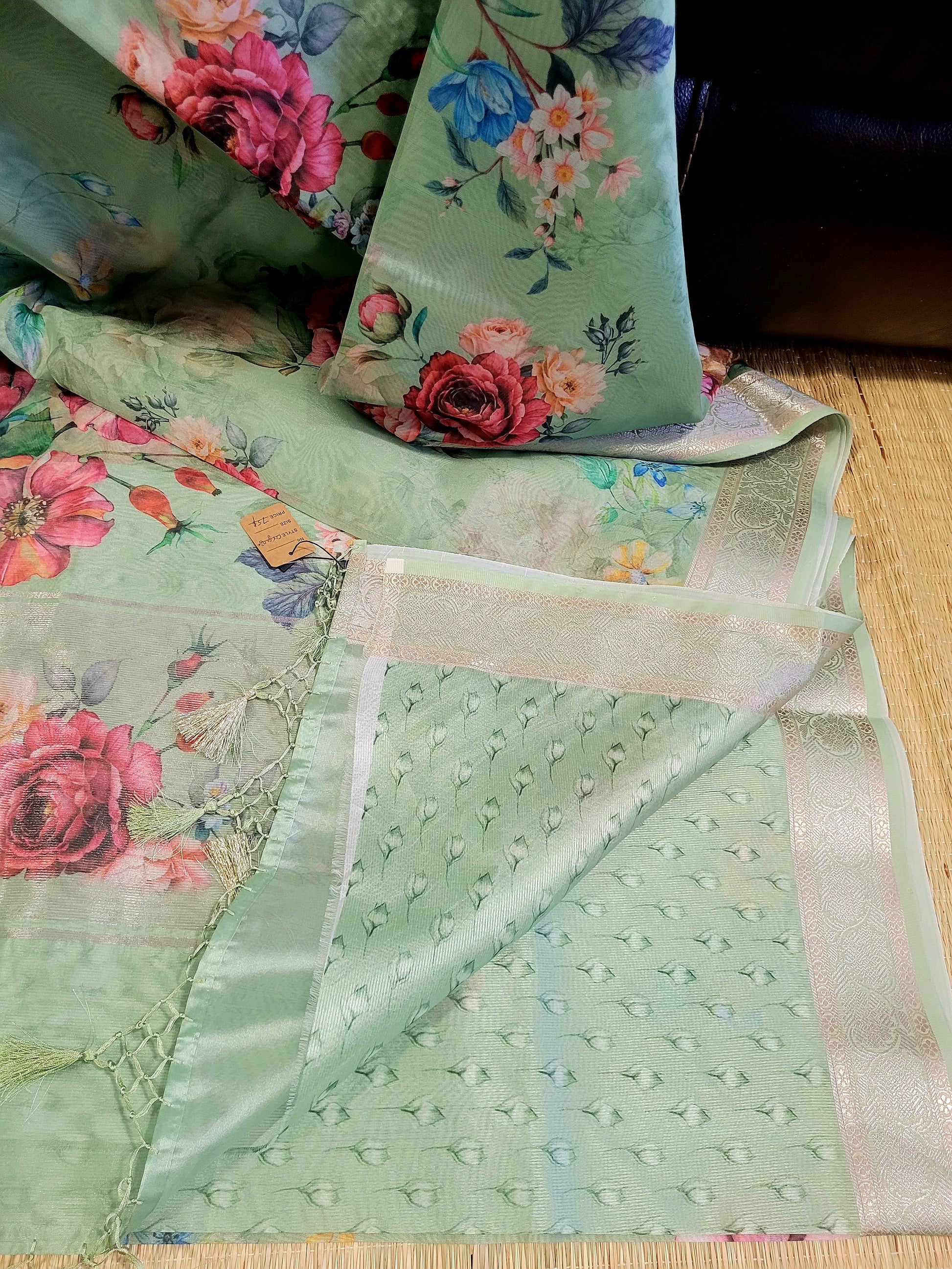 This Printed Organza Banaras Saree features banaras borders on both ends and a stunning zari striped pallu. The accompanying printed silk blouse also has borders, completing the elegant look.