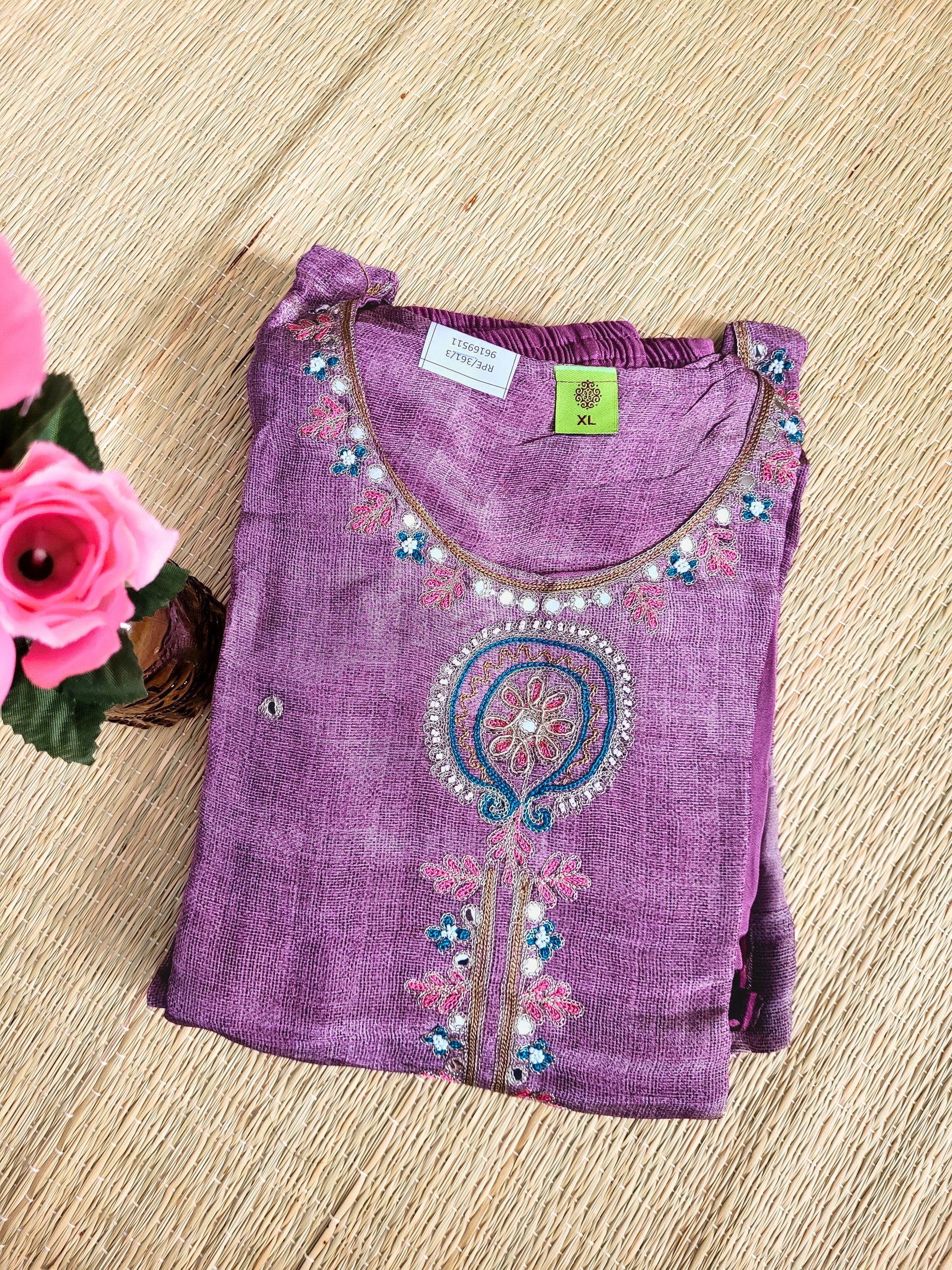 This Pure Tissue Shimmer Salwar Suit in lavender is an exceptional choice, featuring exquisite embroidery on the neckline and sleeves. The Mul Cotton lining ensures a comfortable fit. Complete with Shantoon pants and a printed Tissue dupatta.