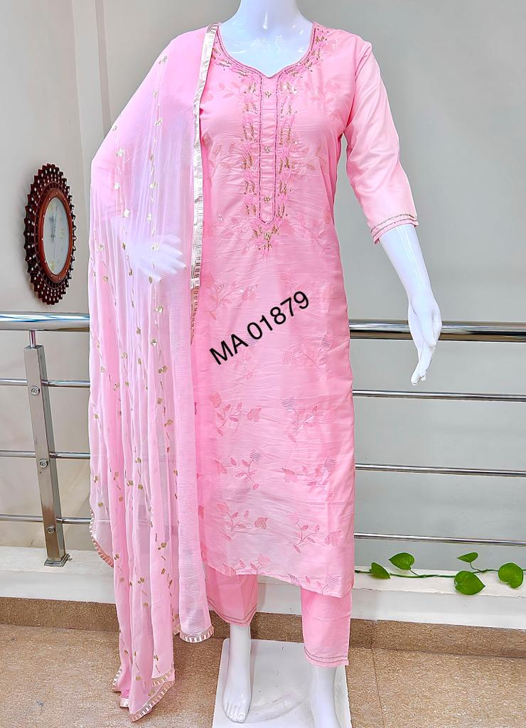 Beautiful baby pink top with embroidery on neckline. Cotton lining given, comes with matching pant and dupatta.