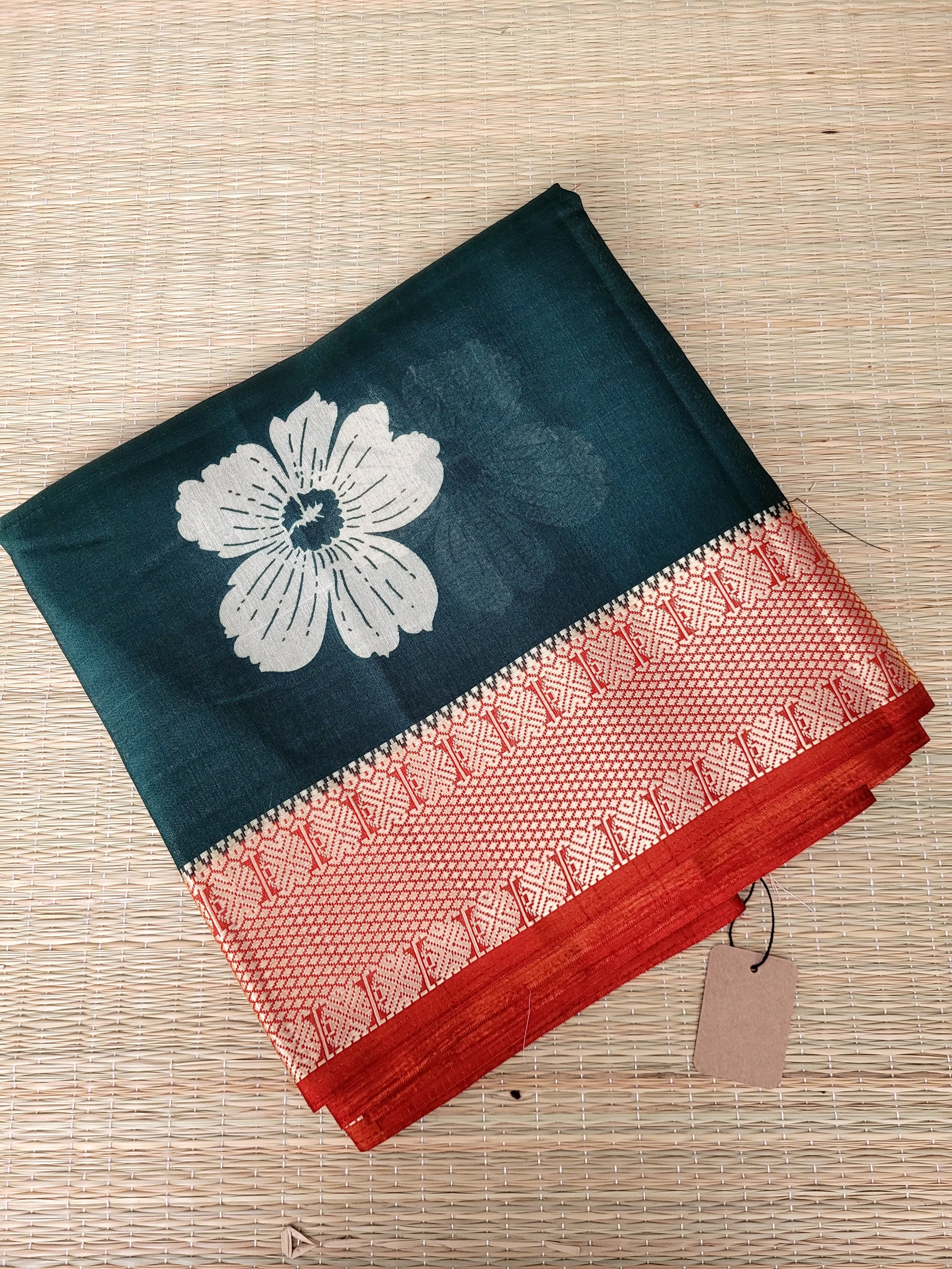 Semi crepe silk printed saree with contrast thread woven borders and blouse piece.