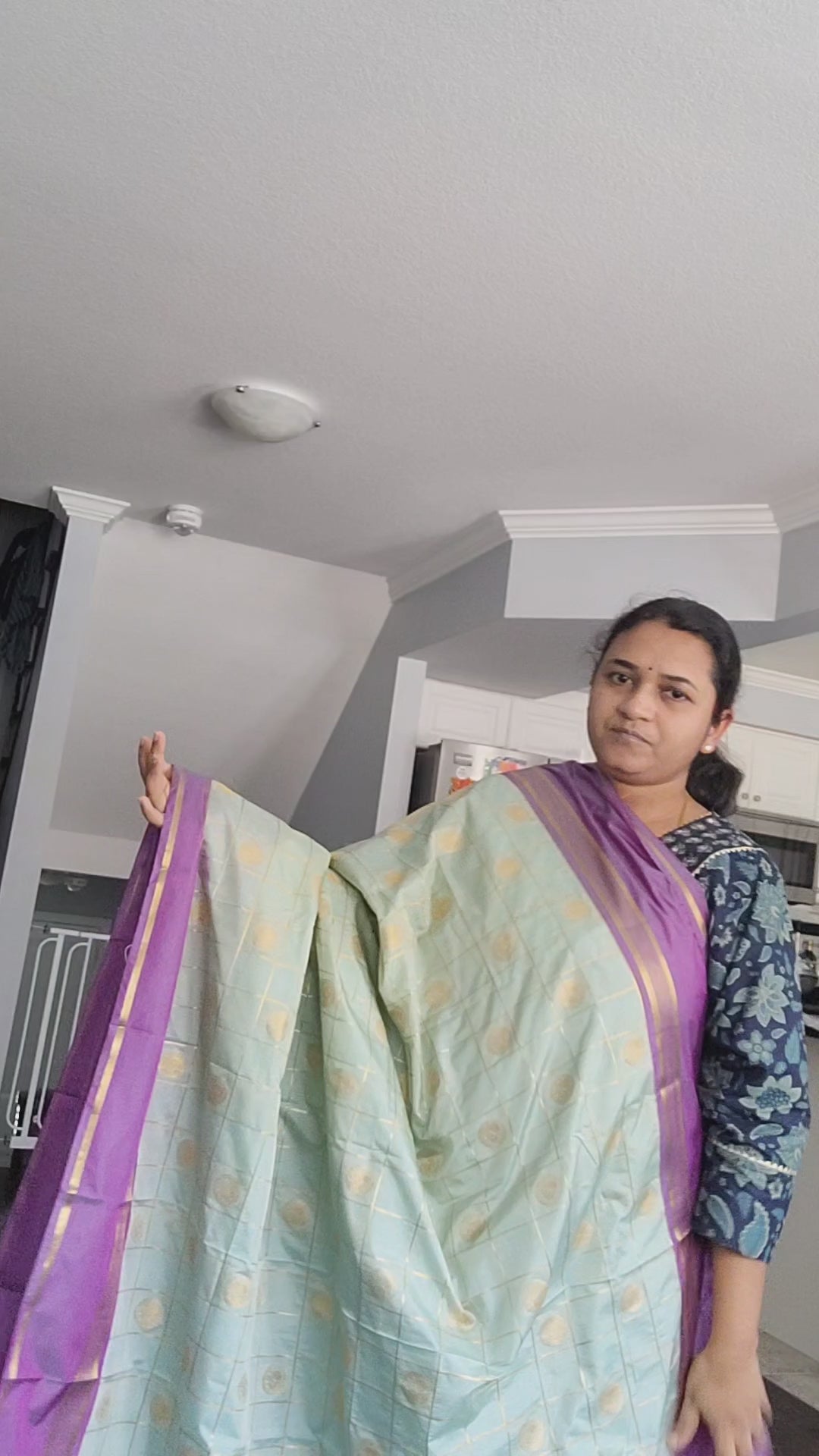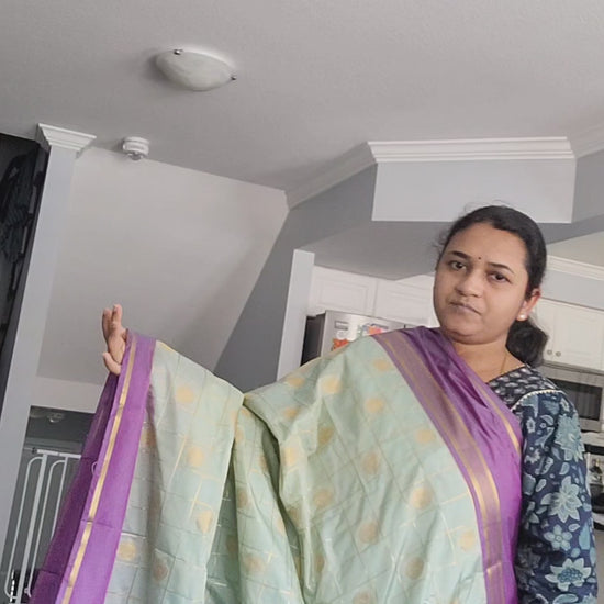 Crafted with the utmost care and expertise, this semi kanchipuram silk saree is luxuriously soft and lightweight, making it effortless to drape. Adorned with check and peacock motifs, as well as mandala designs, the entire body of the saree is a true work of art. The contrasting zari borders and grand headpiece add an elegant touch, while the blouse features a stunning embossed design and horizontal zari stripes. A beautiful and one-of-a-kind color combination makes this saree perfect for any traditional occasion