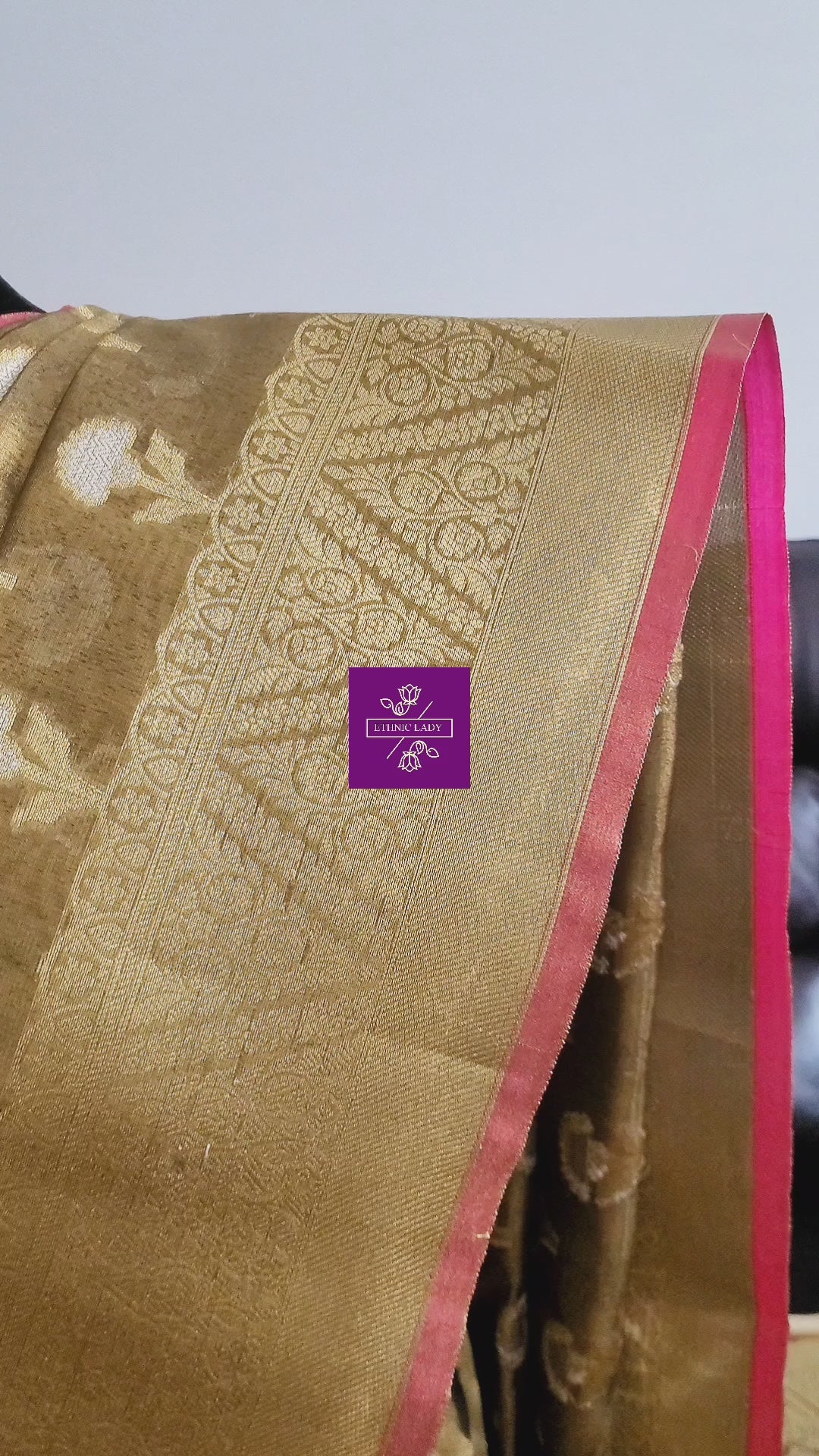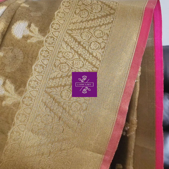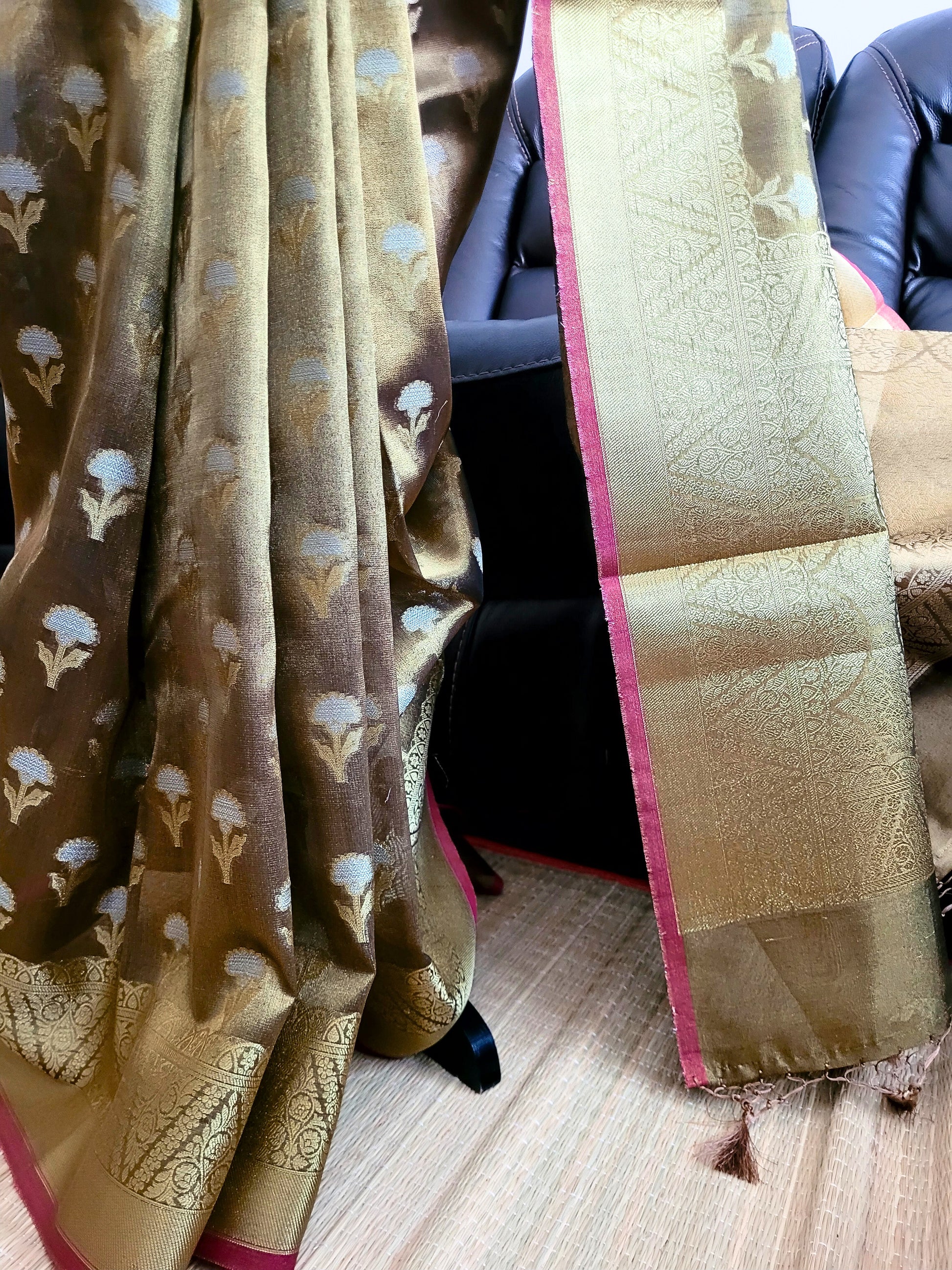 The Tissue Banaras Silk Saree features zari woven borders on both sides, adorned with floral motifs and a grand woven pallu. The blouse piece is intricately crafted with coin butti weaving, perfectly complementing the saree.