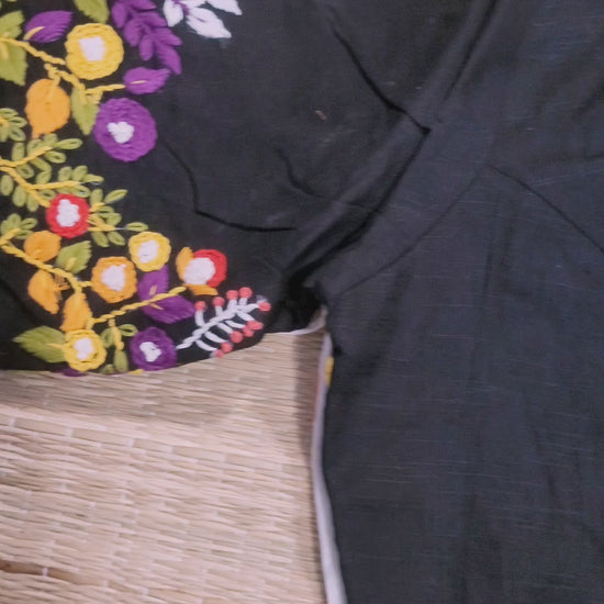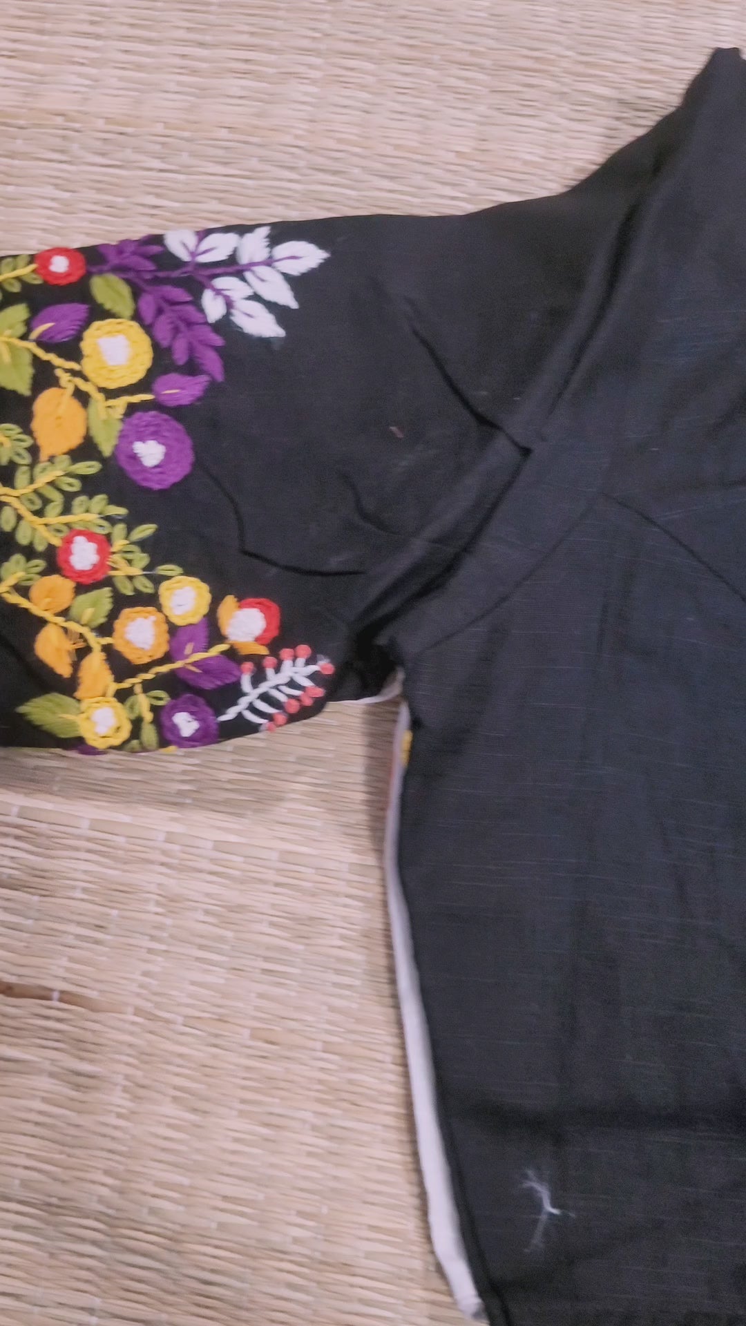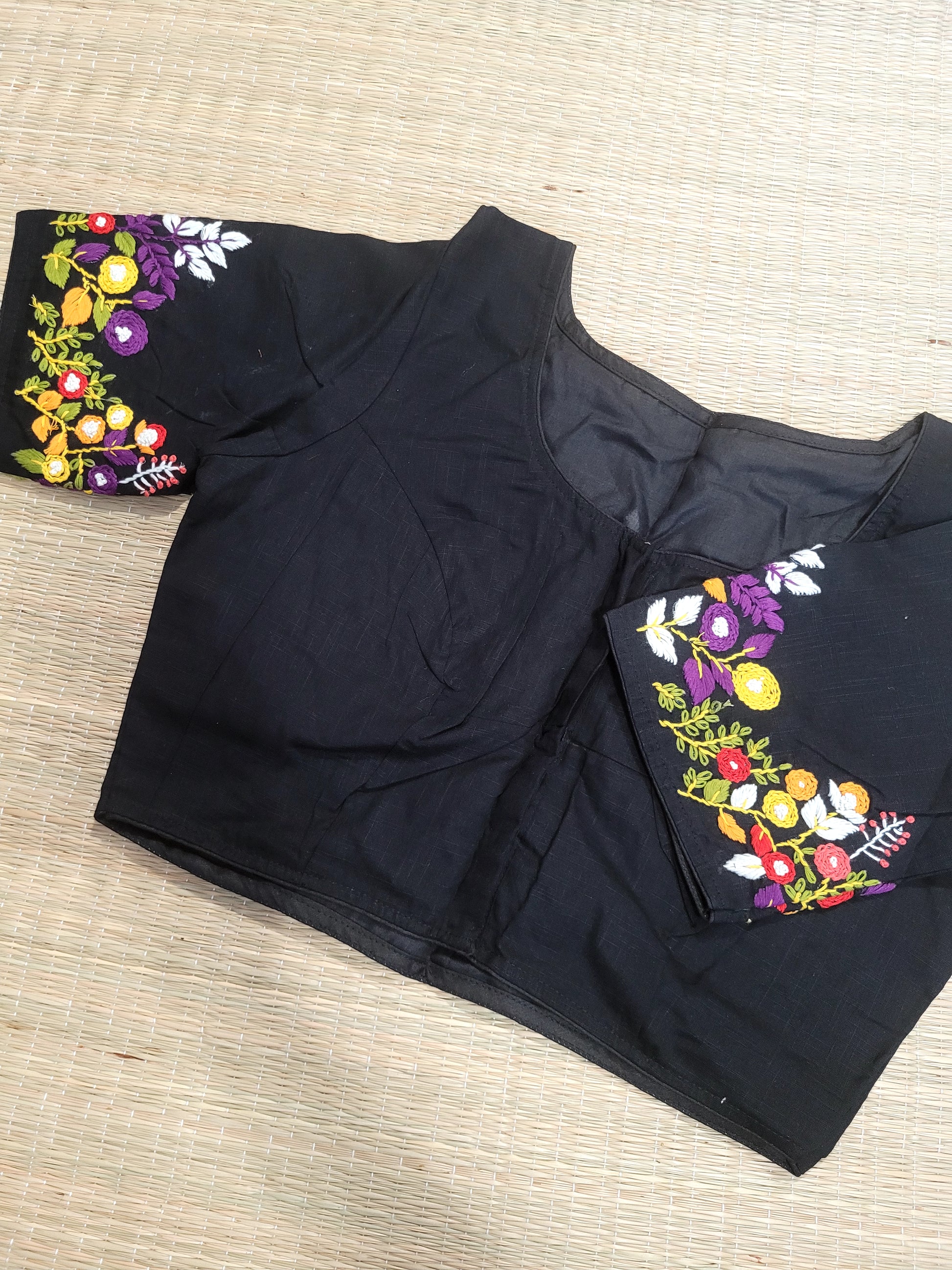This Cotton Katha Blouse features intricate handiwork using multicolor thread. It is available in a free size and can be extended up to size 46. The blouse is non-padded for comfortable wear.