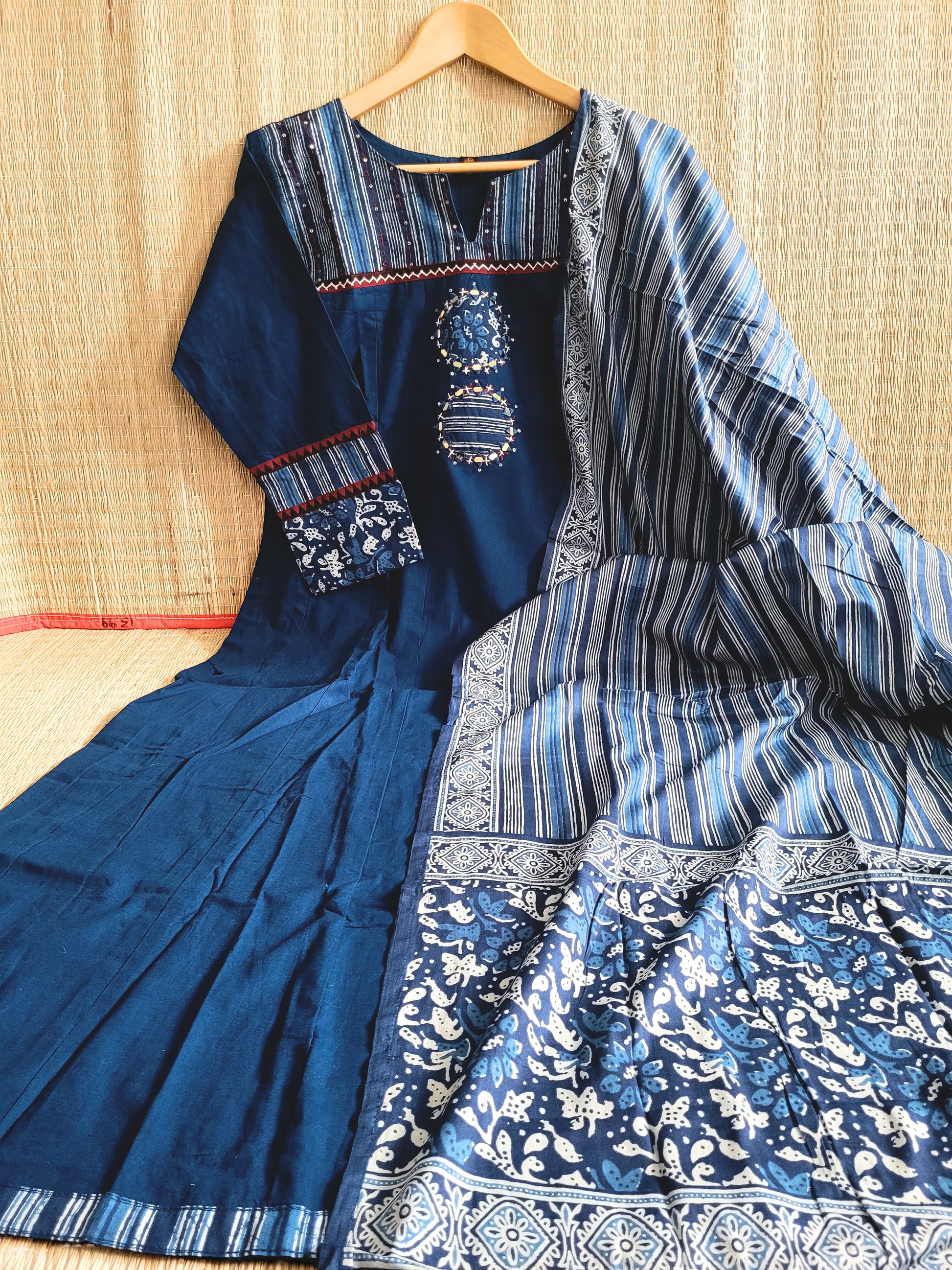 This anarkali suit features intricate ajrakh print and authentic Kutch hand embroidery, making it a unique and elegant piece to add to your wardrobe. It also comes with plain pants and a printed contrast dupatta, creating a balanced and coordinated look.