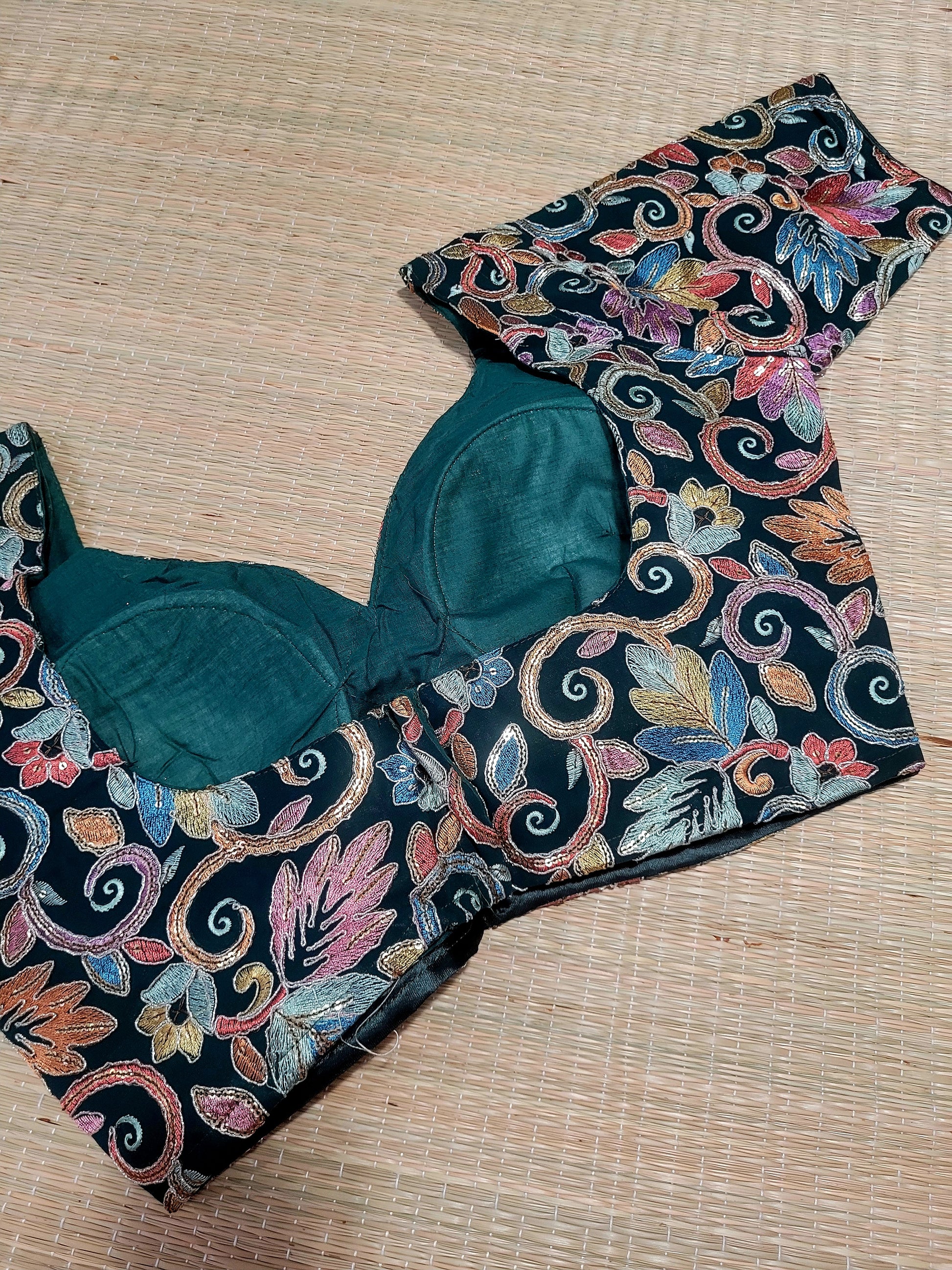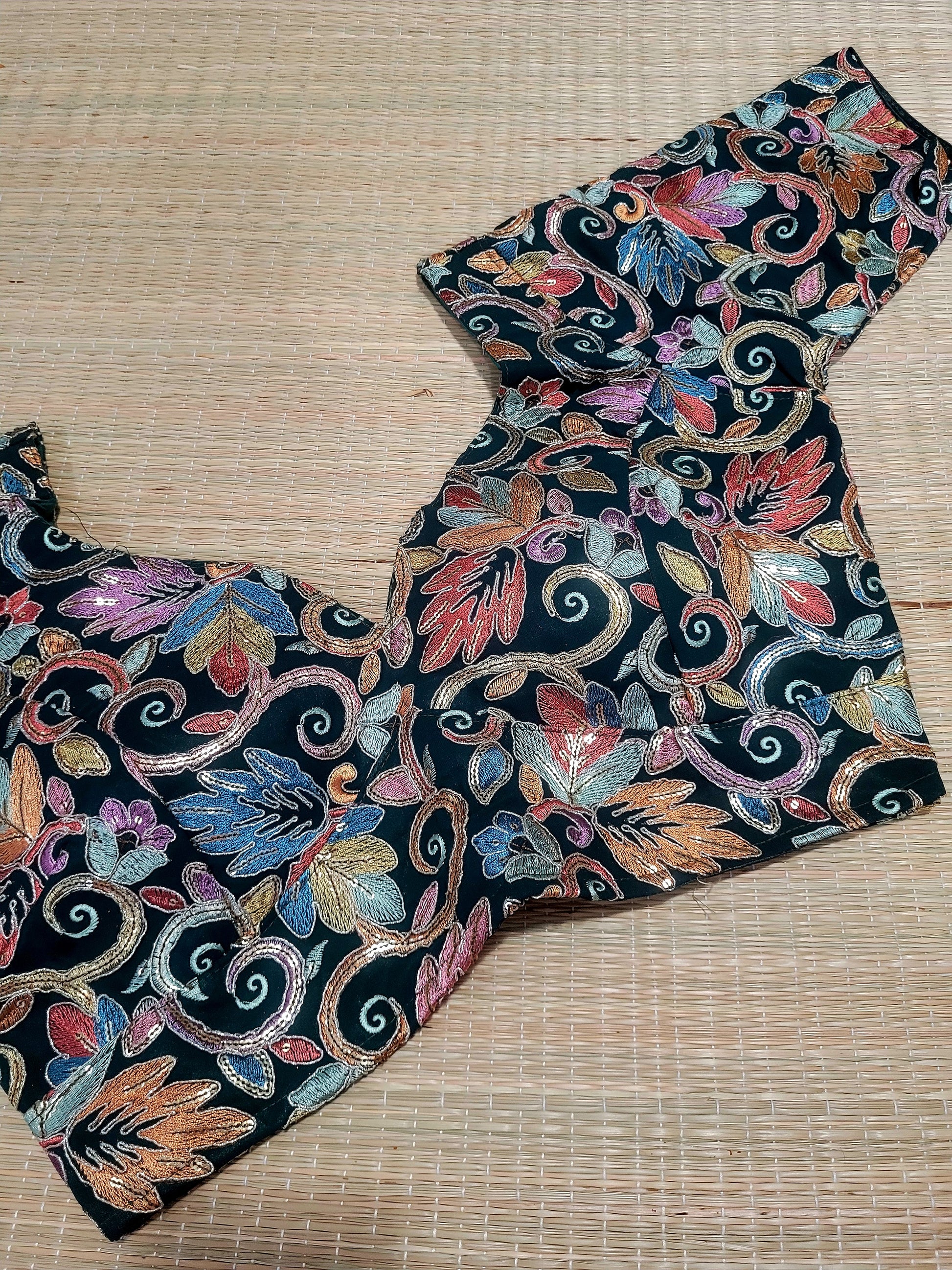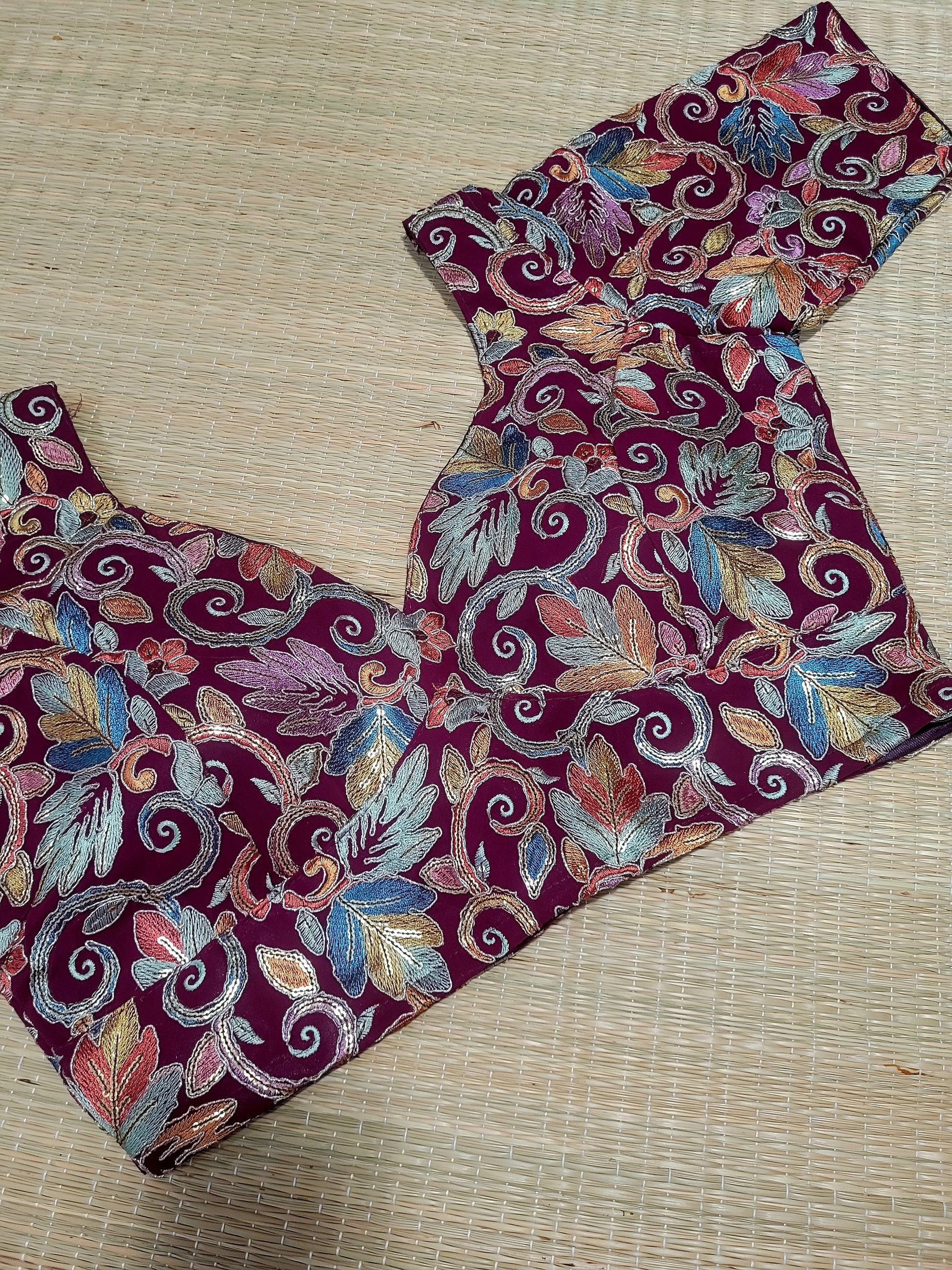 This Viscose Georgette Embroidery Blouse features back hooks and allows for alterations up to size 44.